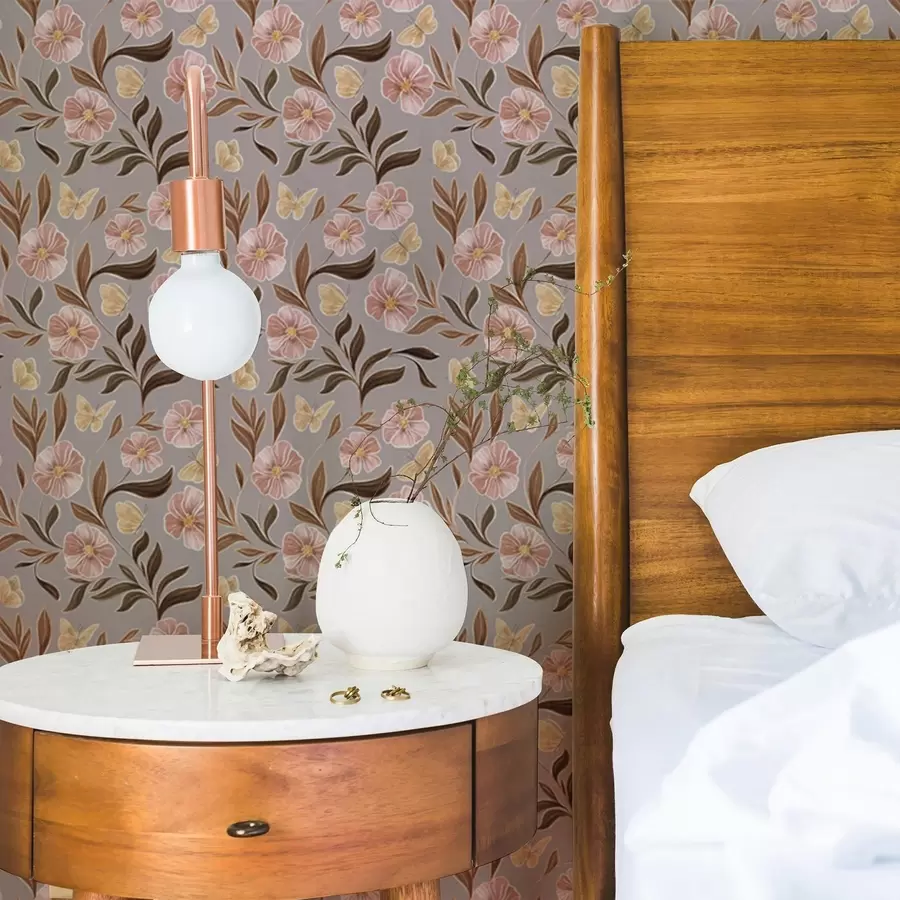 Behang Roze bloemen en vlinders op een grijs-beige achtergrond