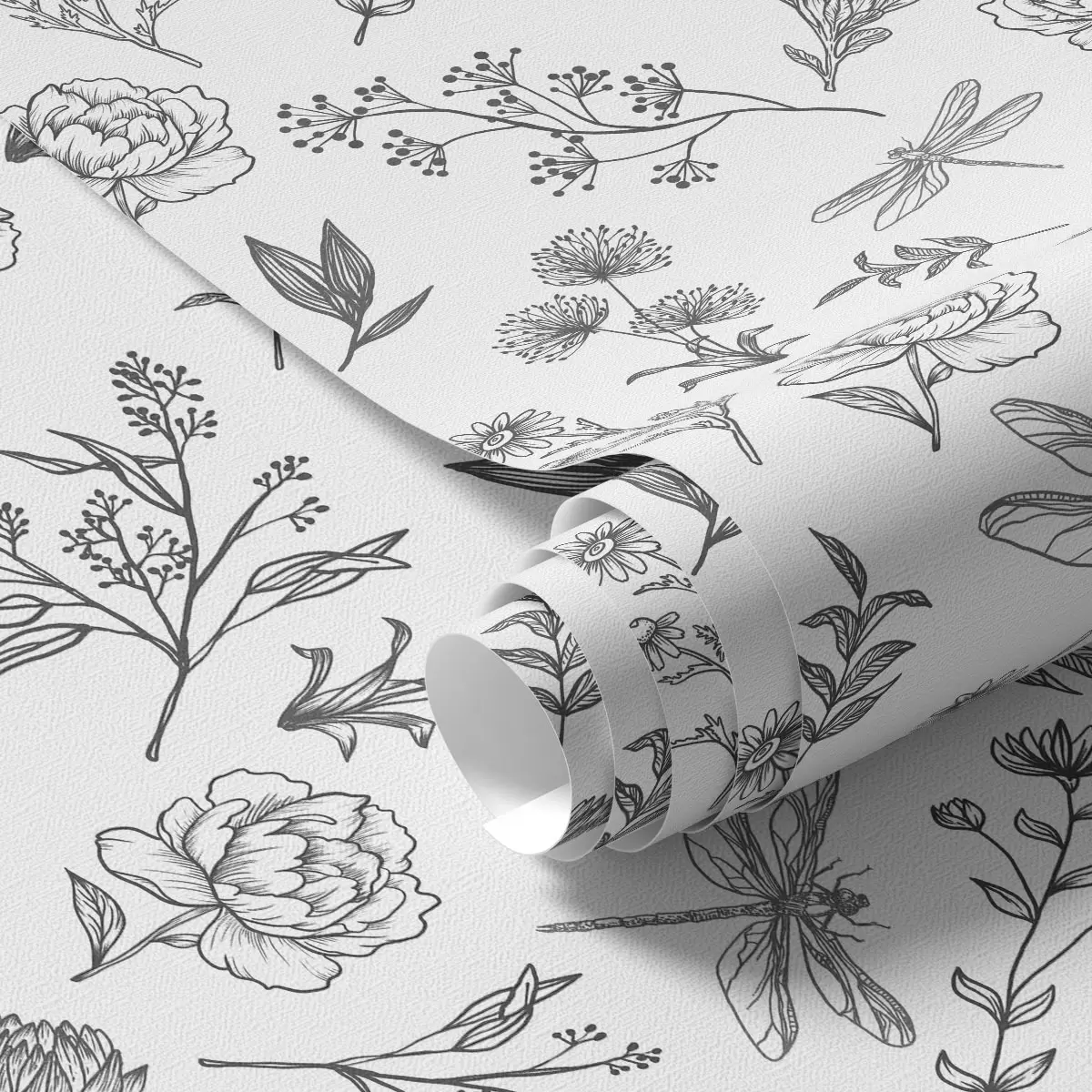 Behang Bloemen, bladeren en libellen op witte achtergrond Nr. a00025v1