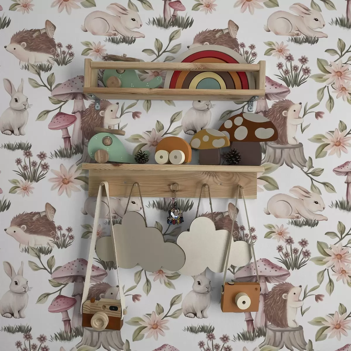 Behang Egels en konijnen op witte achtergrond met delicate bloemen en paddenstoelen Nr. a00111v2