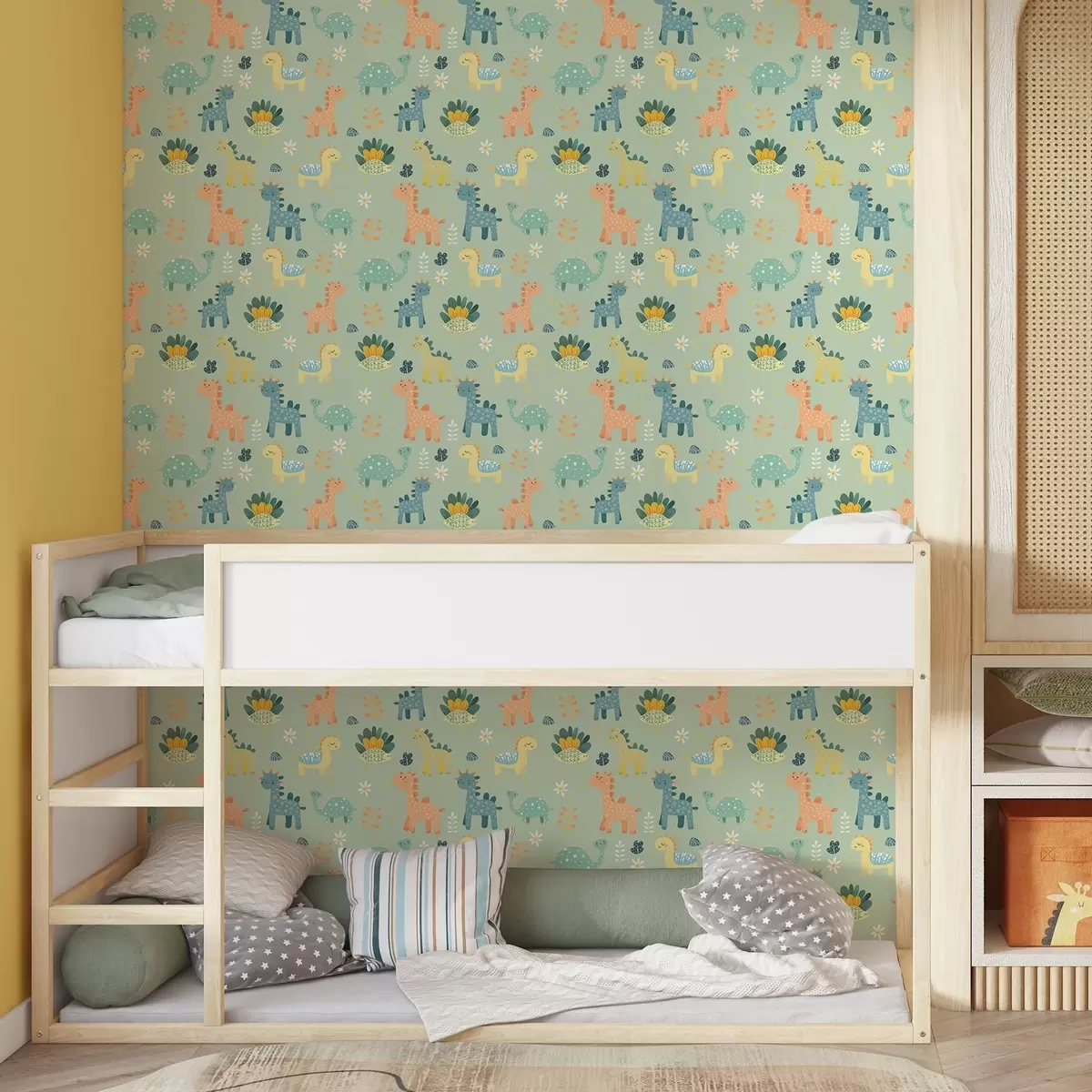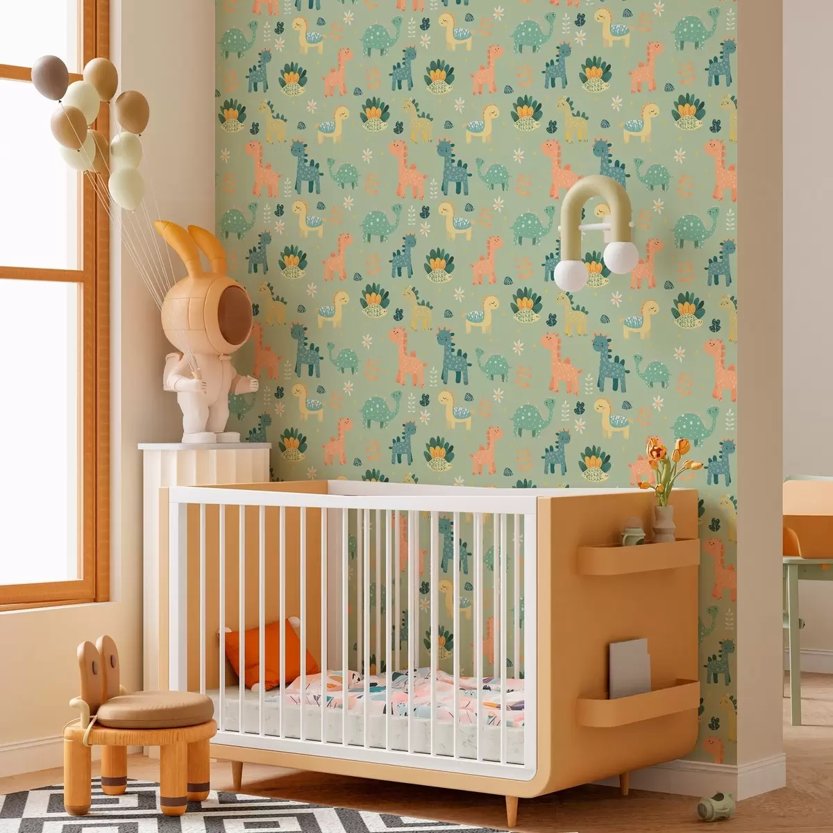 Behang Grappige dinosaurussen in een zachtgroen palet op een lichte achtergrond Nr. a00125v1