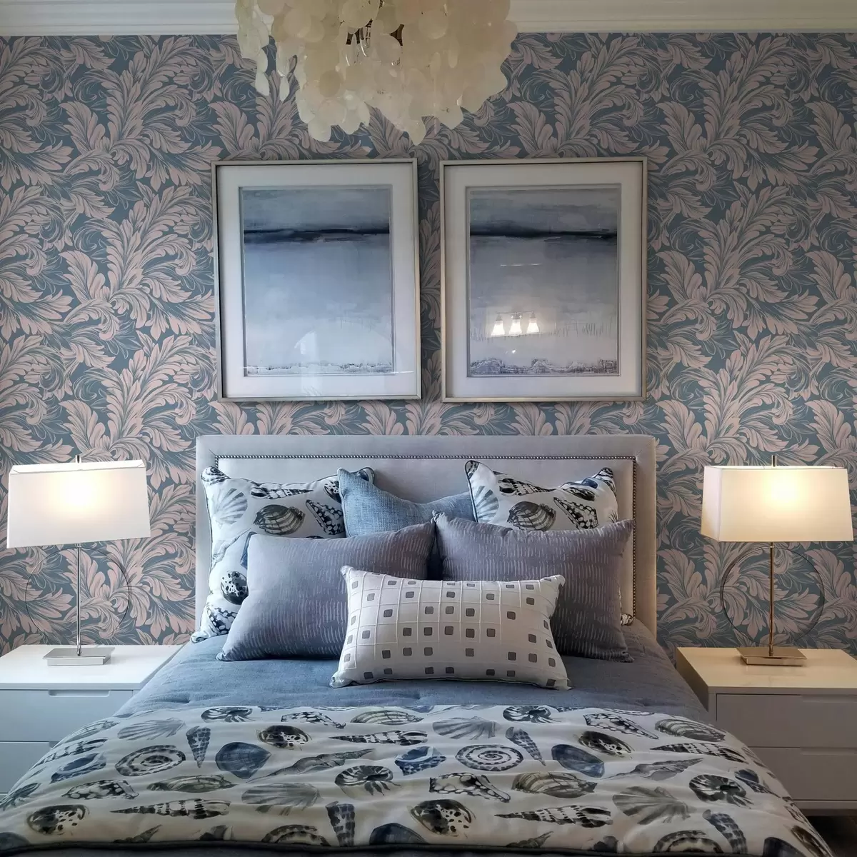 Behang Plantenkrullen in crèmetinten op blauwe en grijze achtergrond Nr. a00135v2