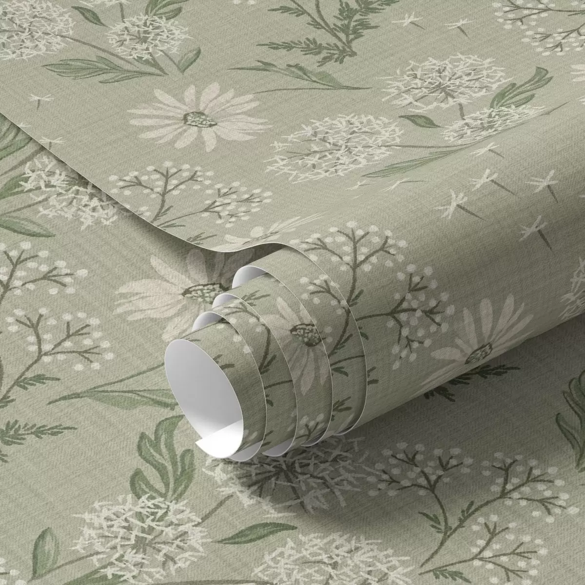 Behang Paardenbloemen en madeliefjes, botanisch patroon op grijsgroene achtergrond Nr. a00224