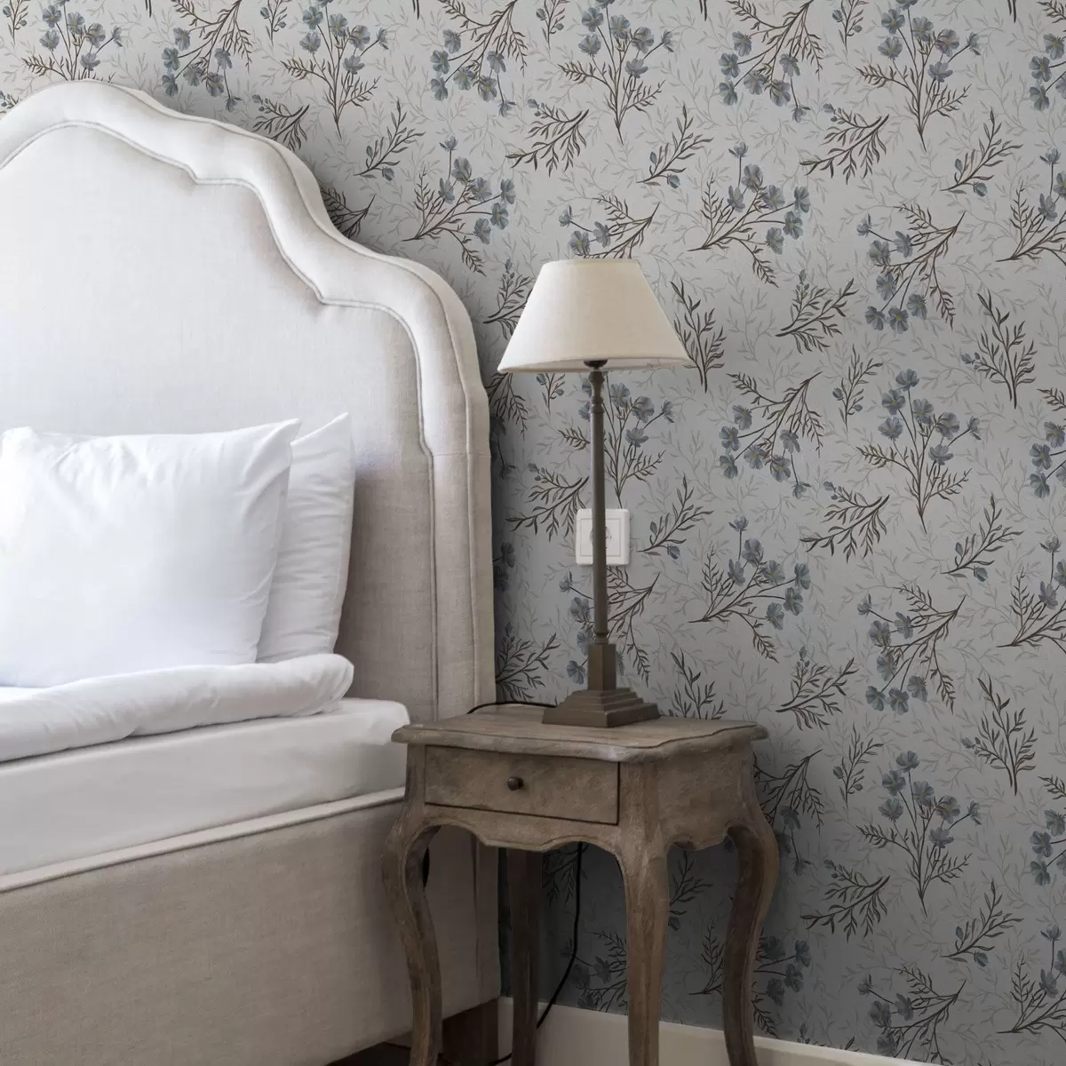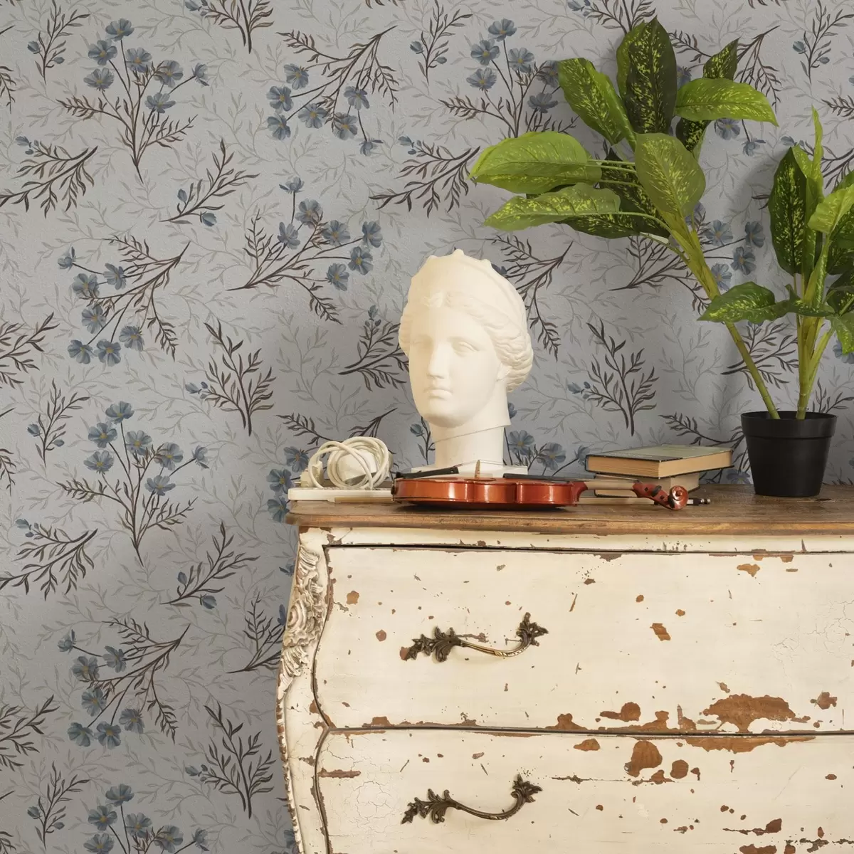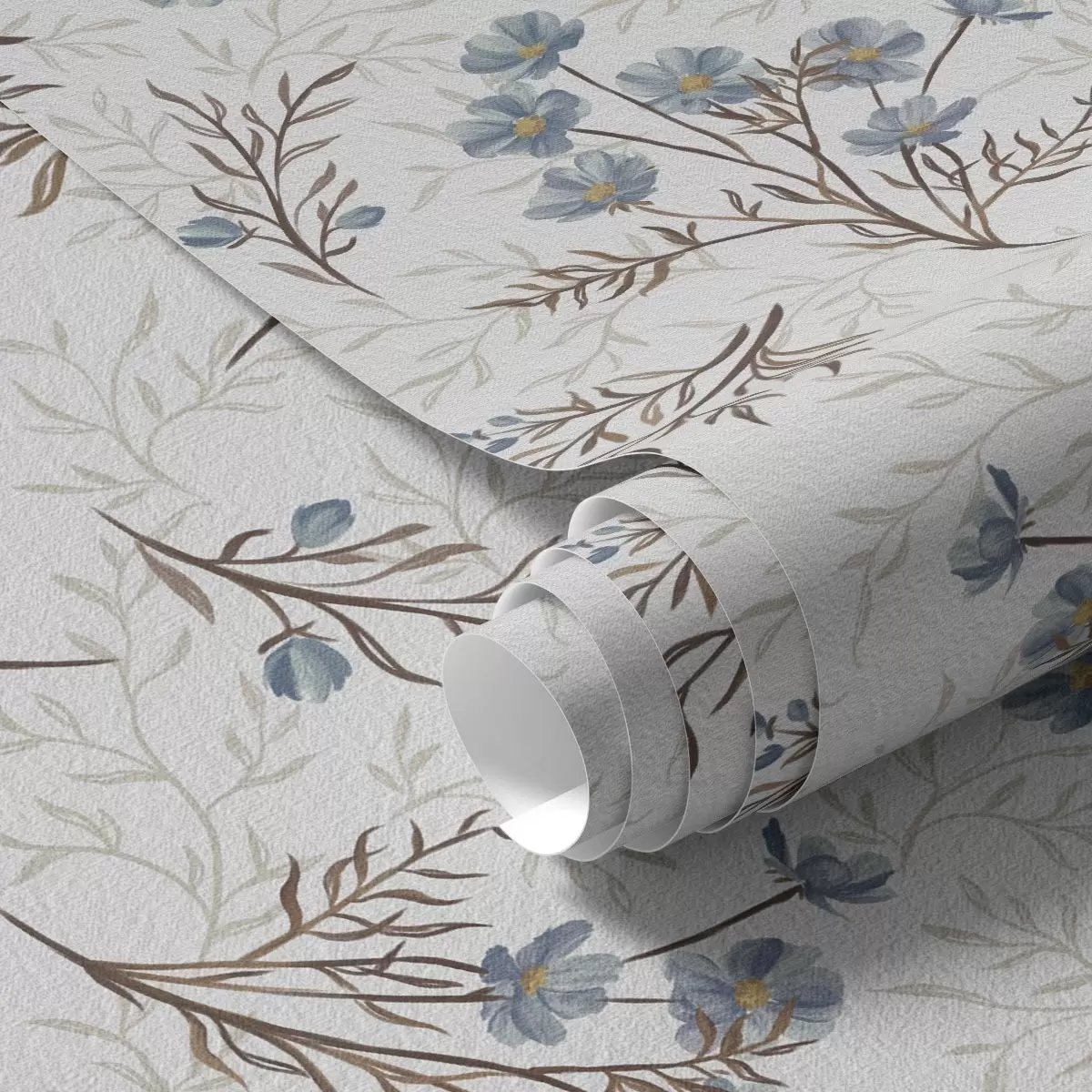 Behang Blauwe bloemen en lichte takken op een witte achtergrond Nr. a00265v1