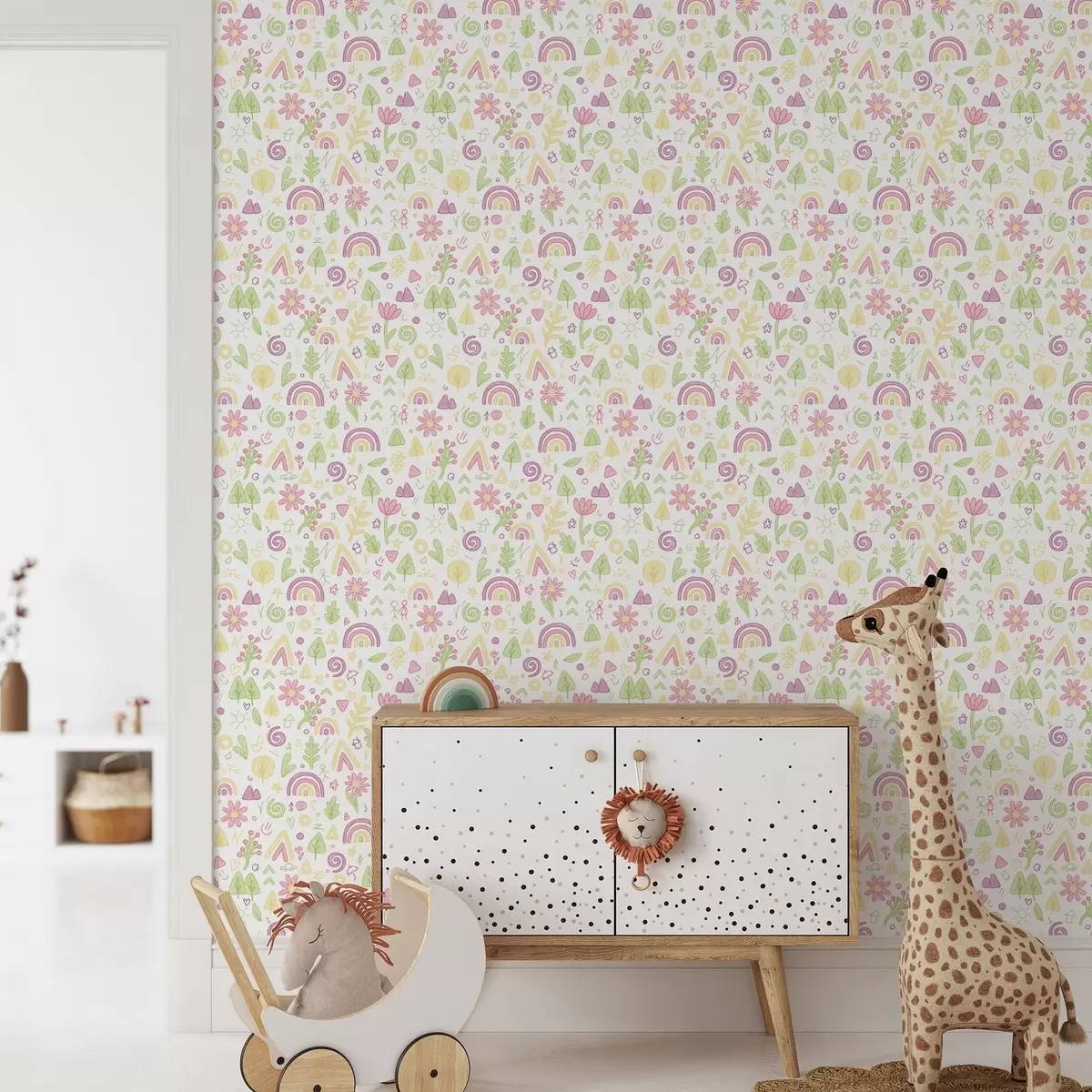 Behang Kindertekening met regenbogen, bloemen en bomen Nr. a00296