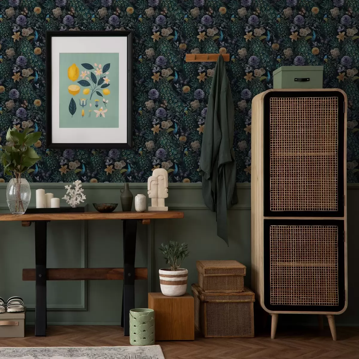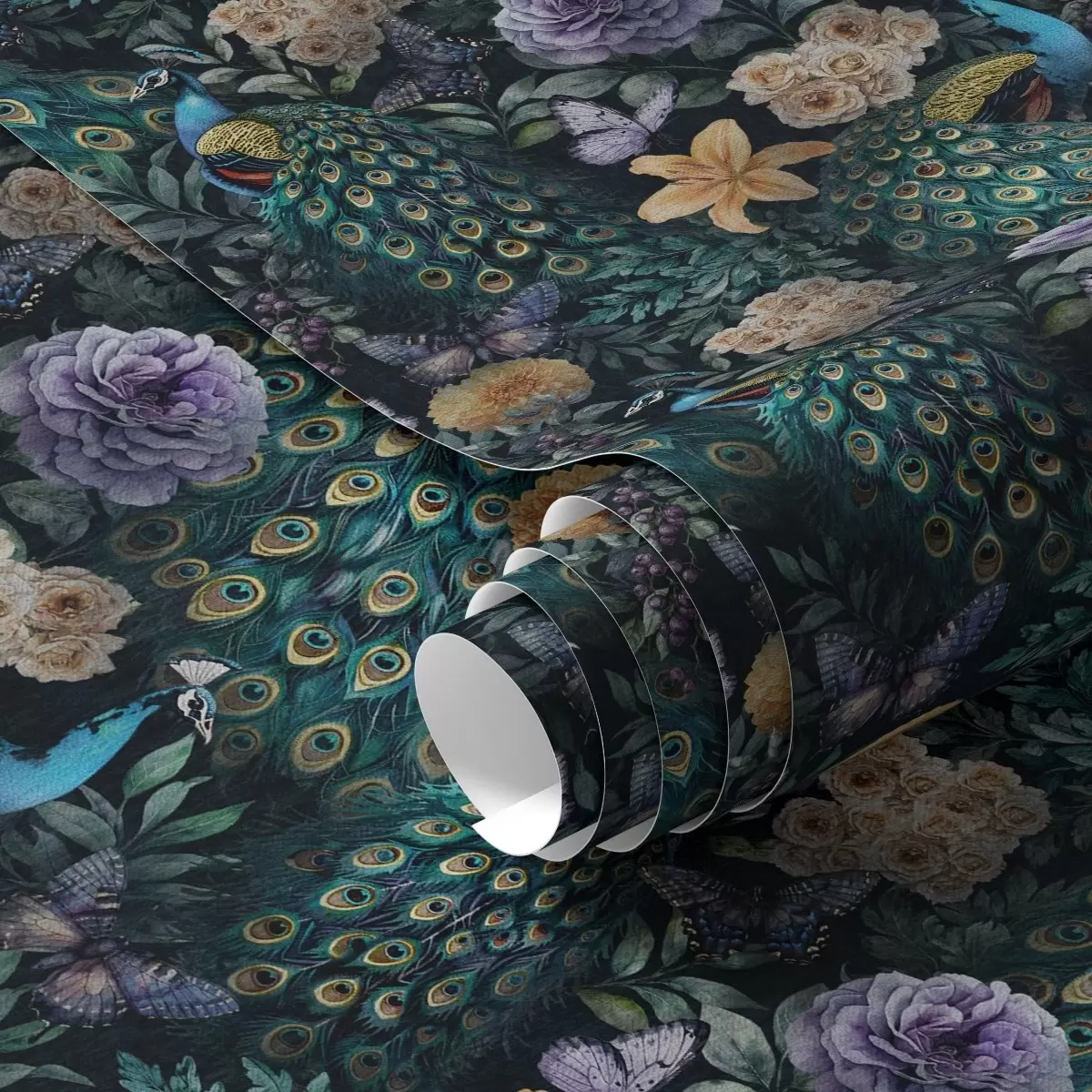 Behang Pauwen tussen donkere bloemen en vlinders Nr. a00348