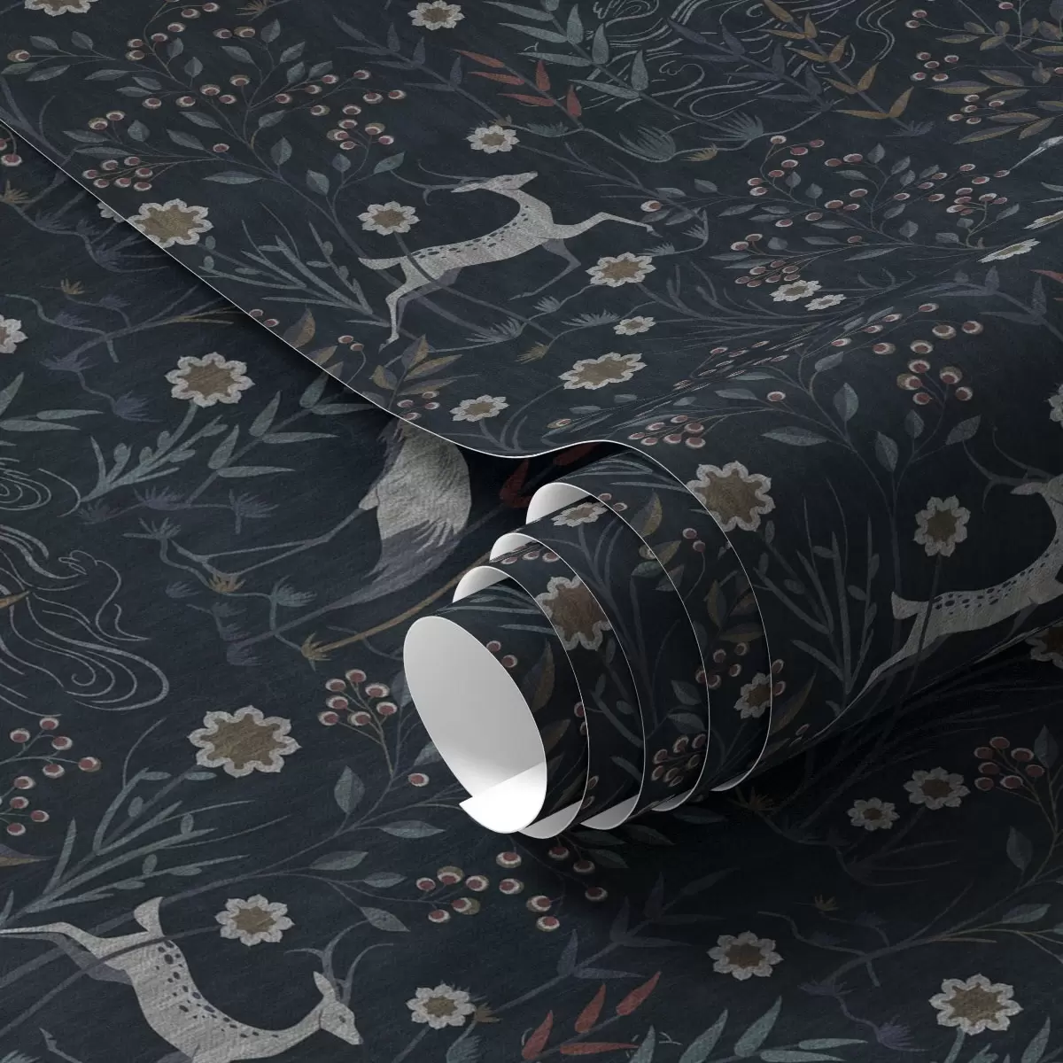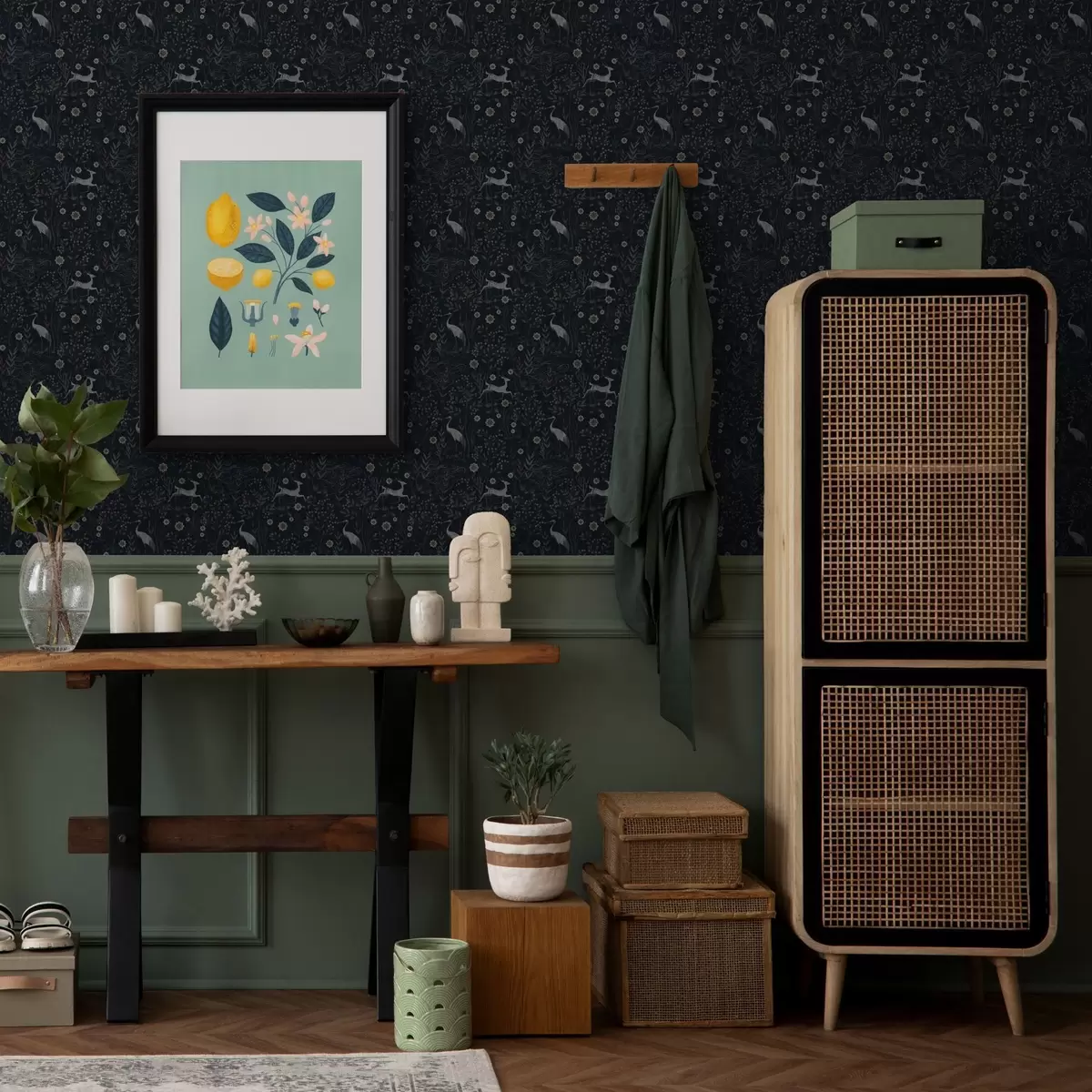 Behang Donkere achtergrond met witte vogels en herten Nr. a00363