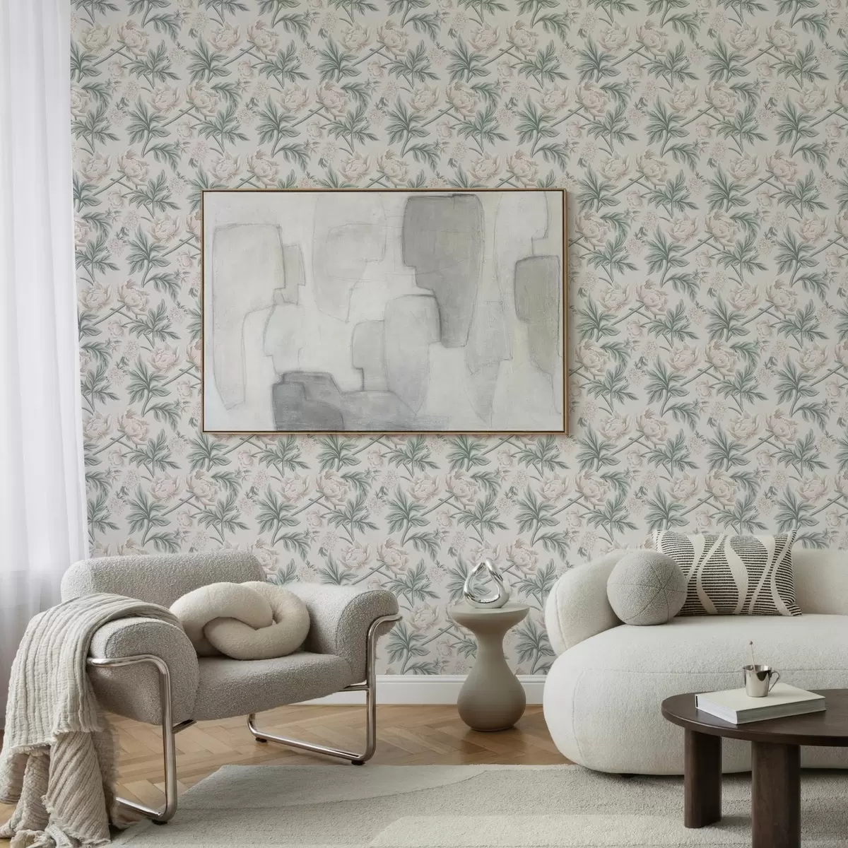 Behang Weelderige pioenrozen in licht beige en groen beige en groen Nr. a00445