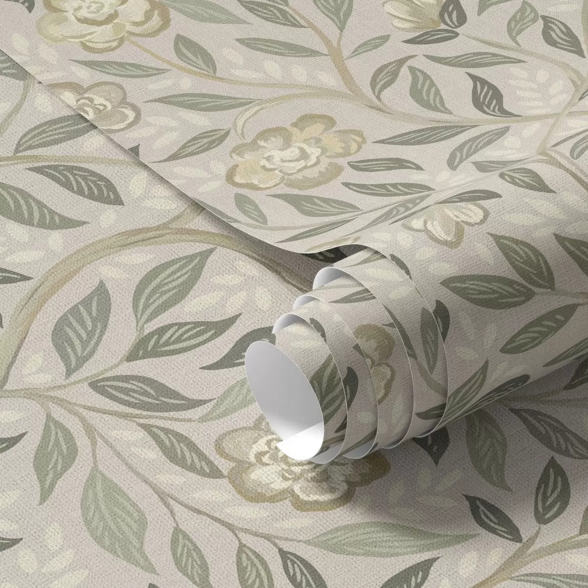 Behang Crème rozen en olijfblaadjes op stoffig roze achtergrond Nr. a00455
