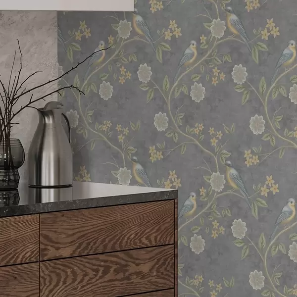 Behang Vogels op takken tussen bloemen op een grijze achtergrond Nr. a00483