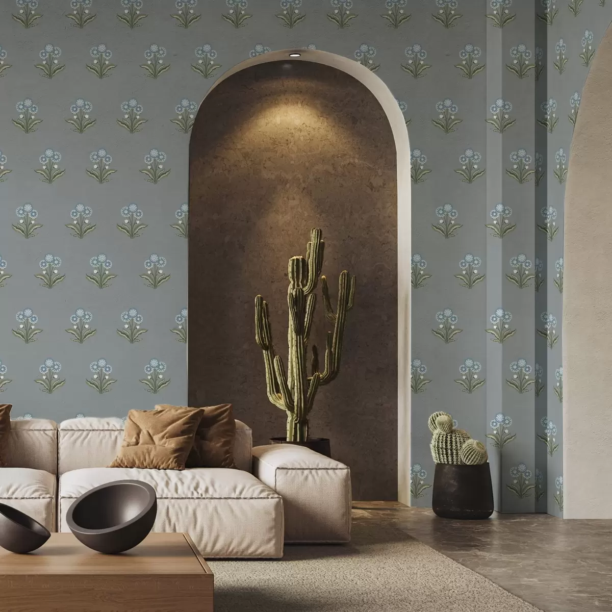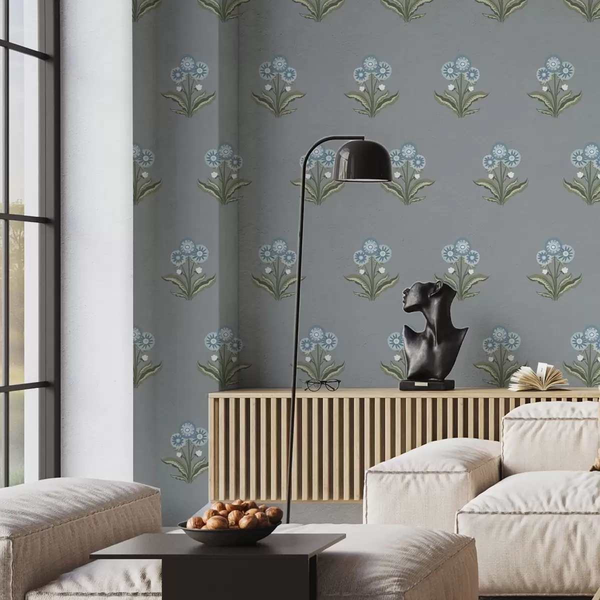 Behang Gestileerde bloemen op een grijsblauwe achtergrond, koel kleurenpalet Nr. a00494v1