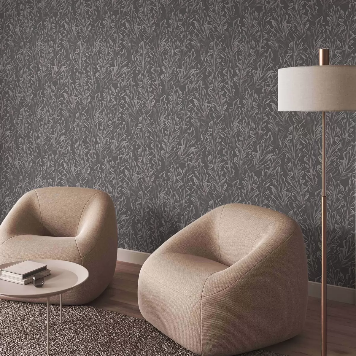 Behang Golvende bladeren op een grafietkleurige achtergrond, hoog contrast Nr. a00495v1