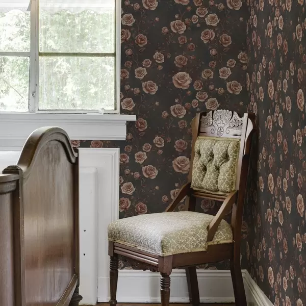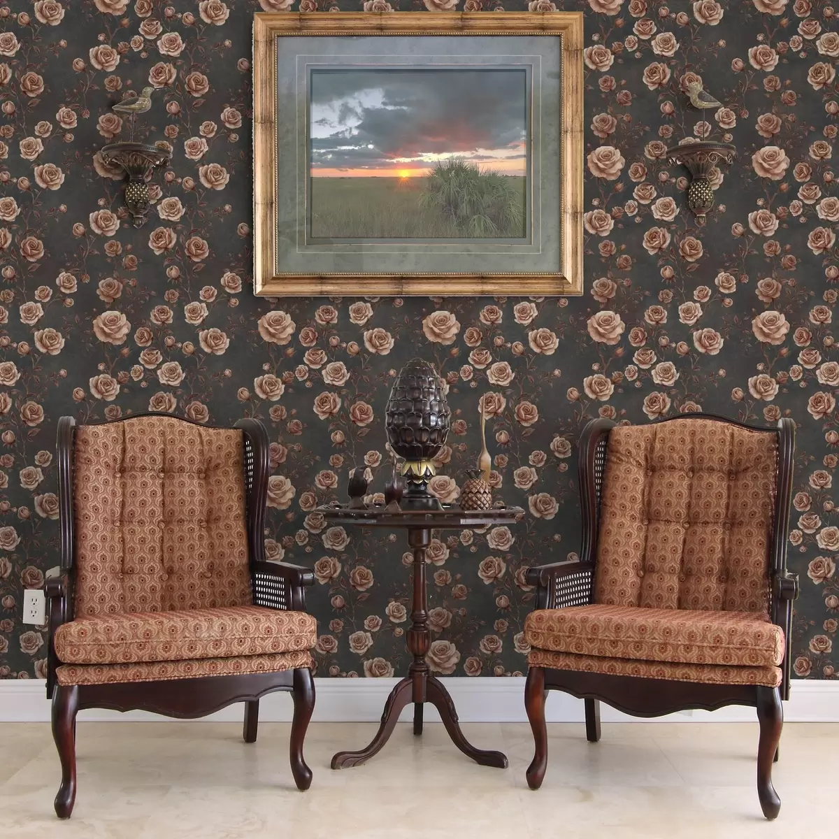 Behang Vintage rozen op een grafietkleurige achtergrond, terracotta kleurenpalet Nr. a00497v1