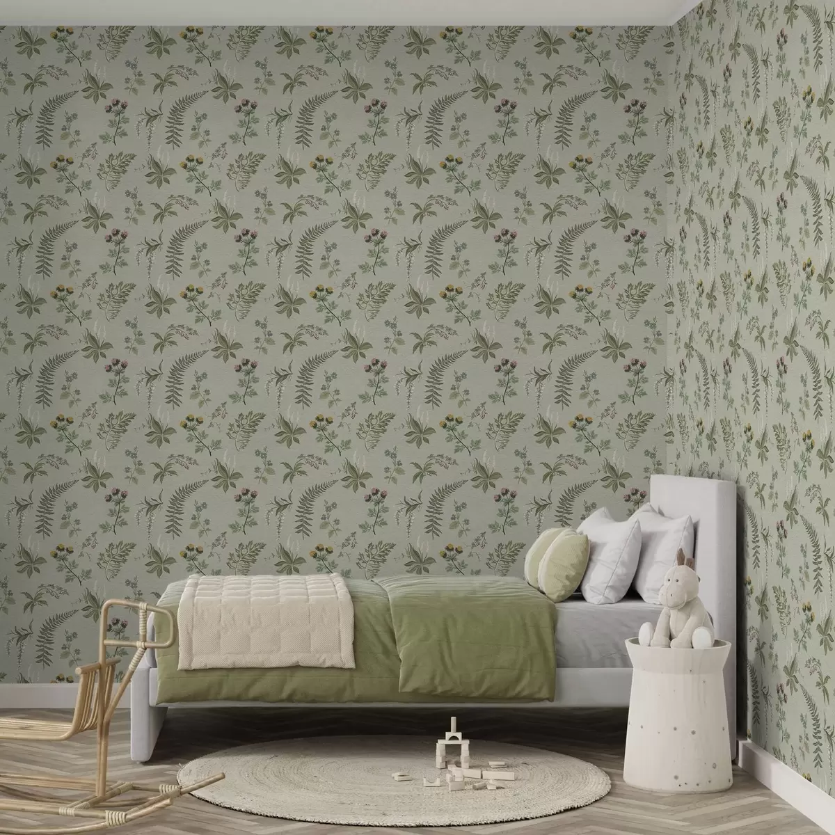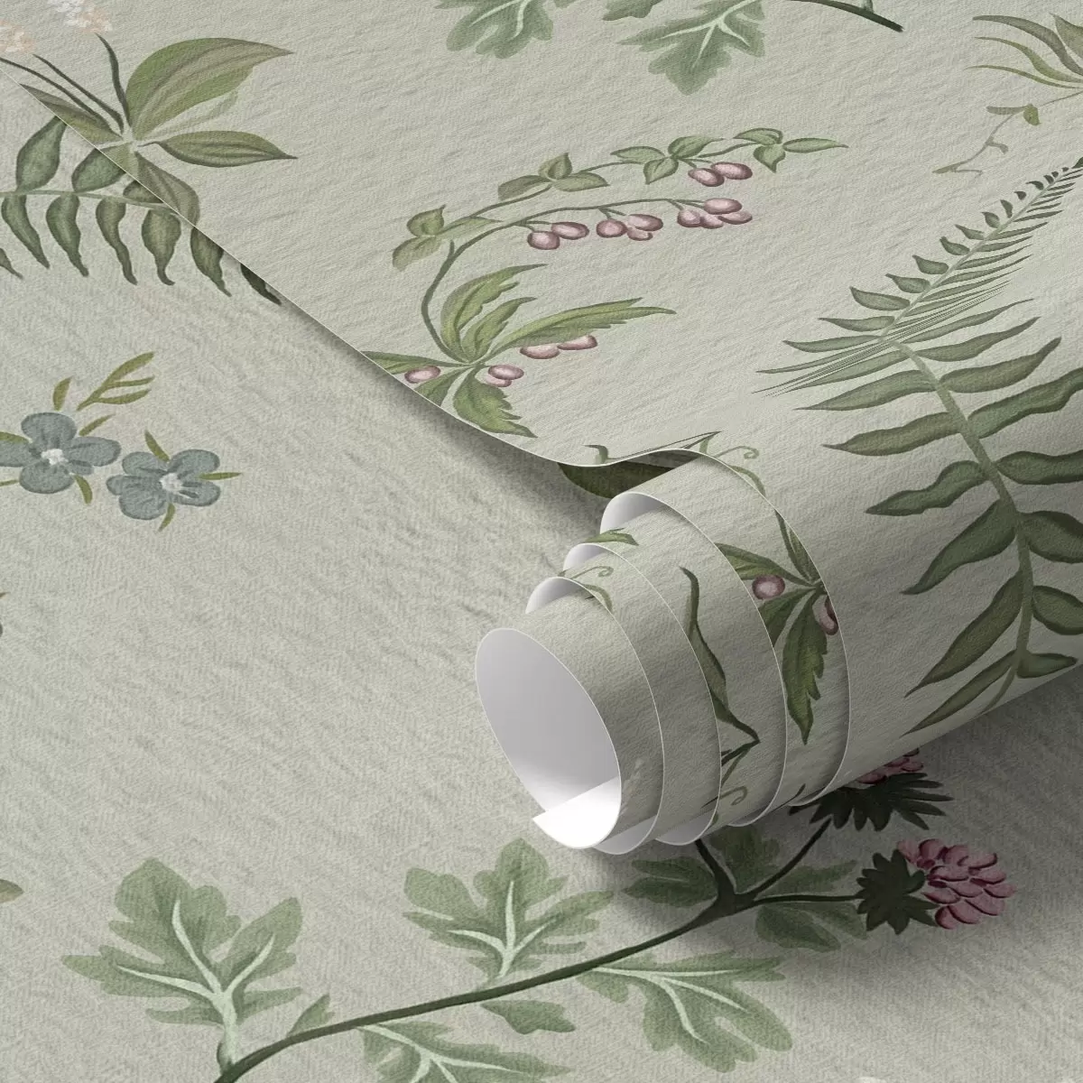 Behang Botanische grassen en varens op licht grijsgroen Nr. a00498
