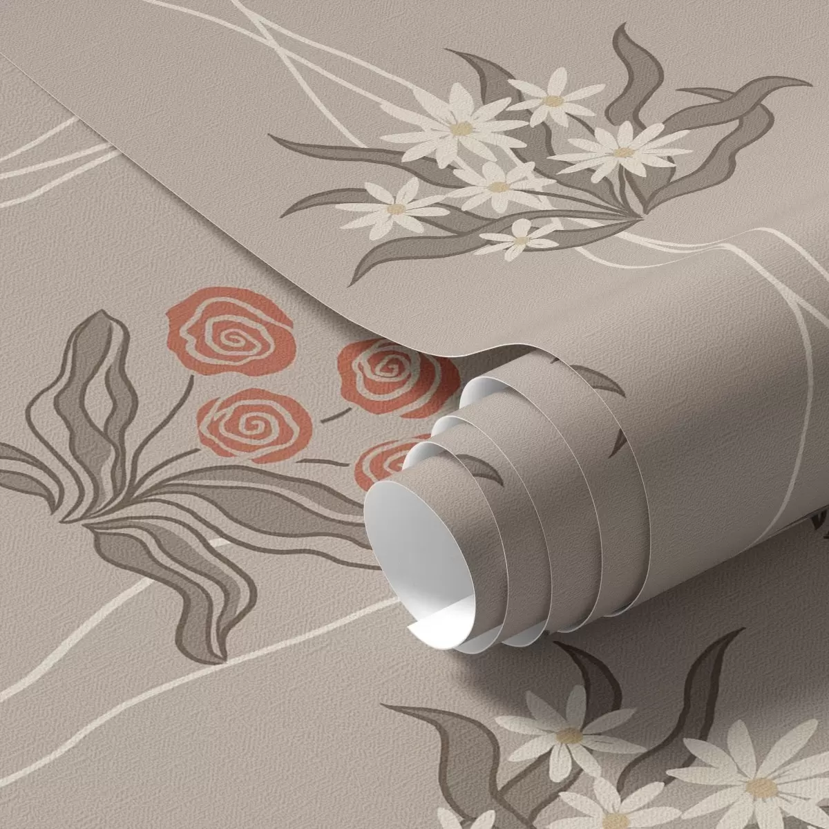 Behang Retro bloemen met golvende lijnen op warm beige Nr. a00503