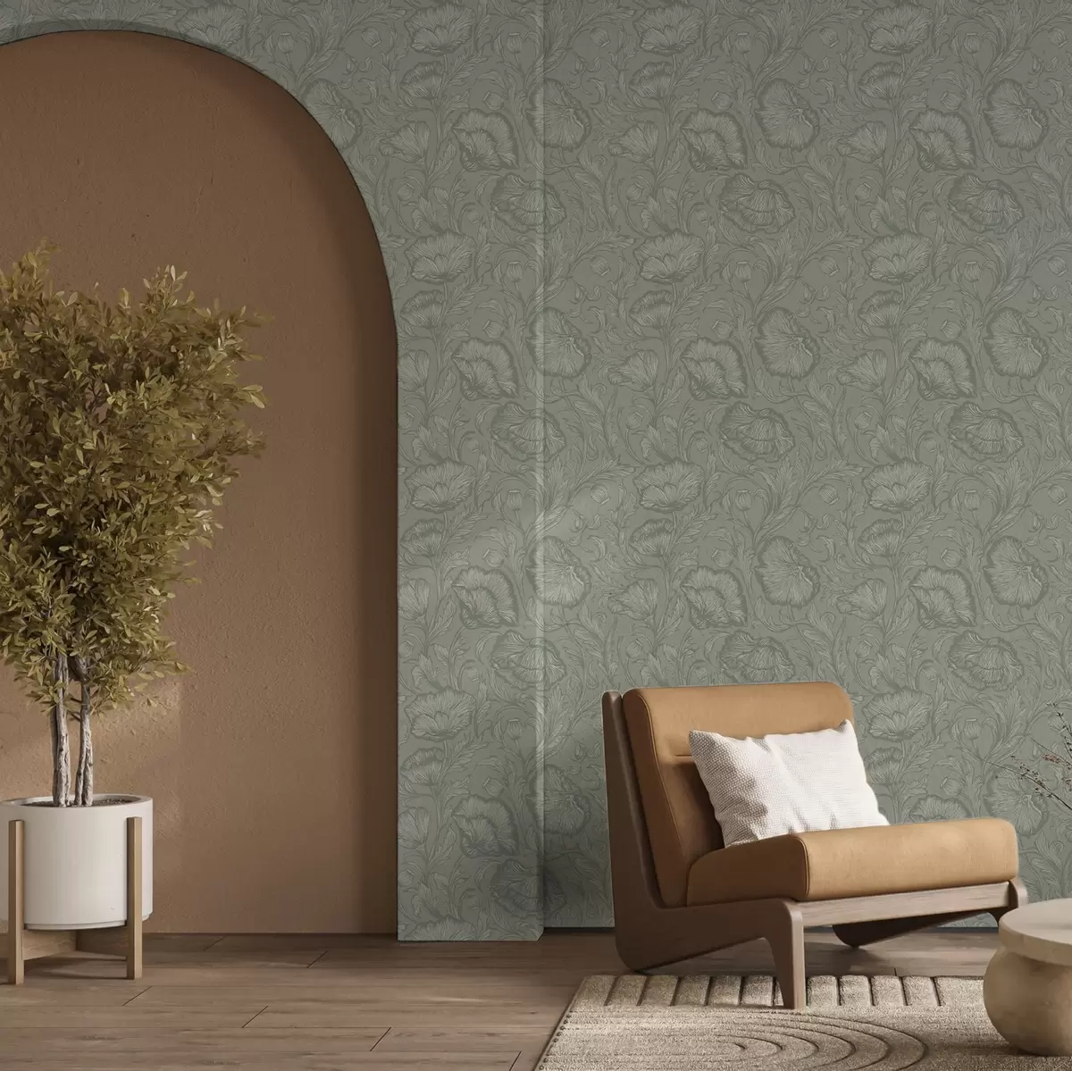 Behang Lijntekeningen van klaprozen op een grijsgroene achtergrond Nr. a00572v1