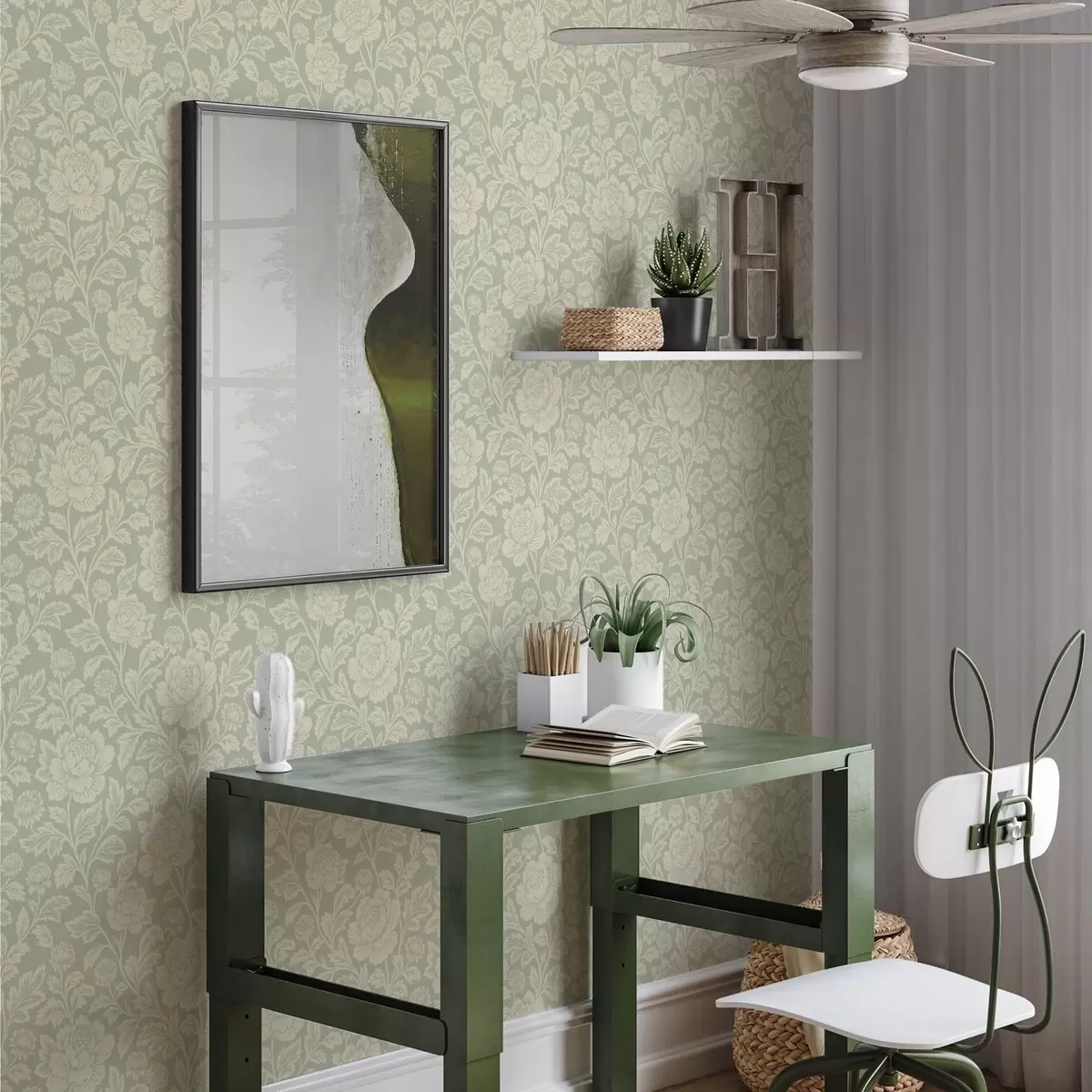 Behang Grote lijntekeningen van pioenrozen op een saliegroene achtergrond Nr. a00582
