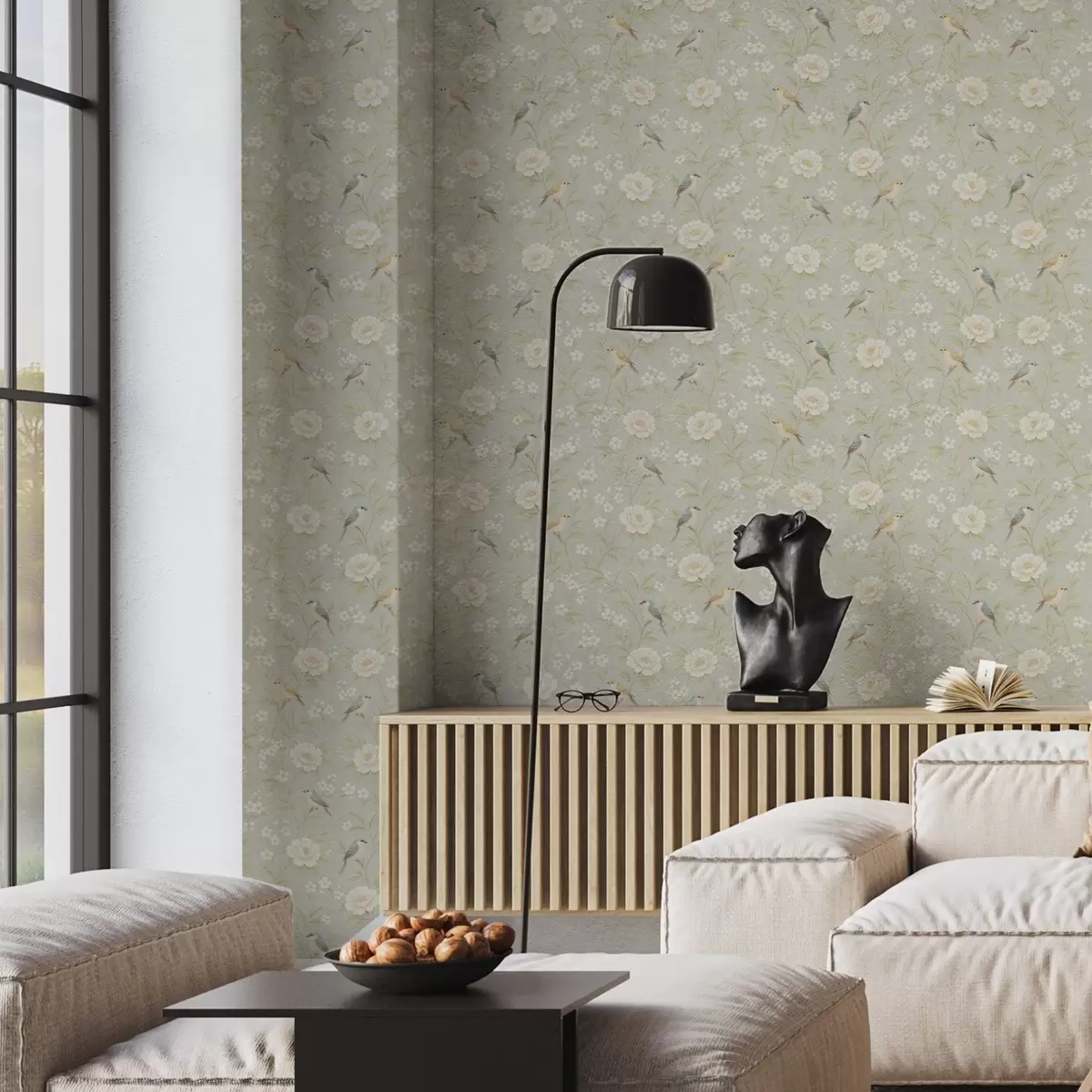 Behang Vogels tussen witte bloesems op een grijsgroene achtergrond Nr. a00583