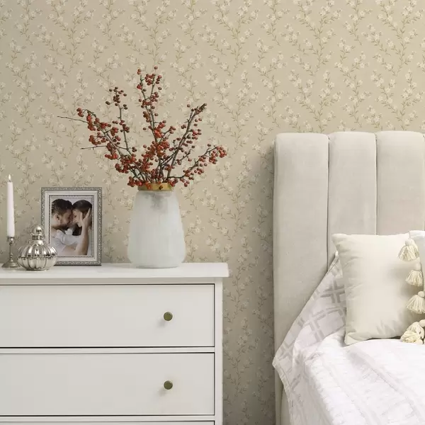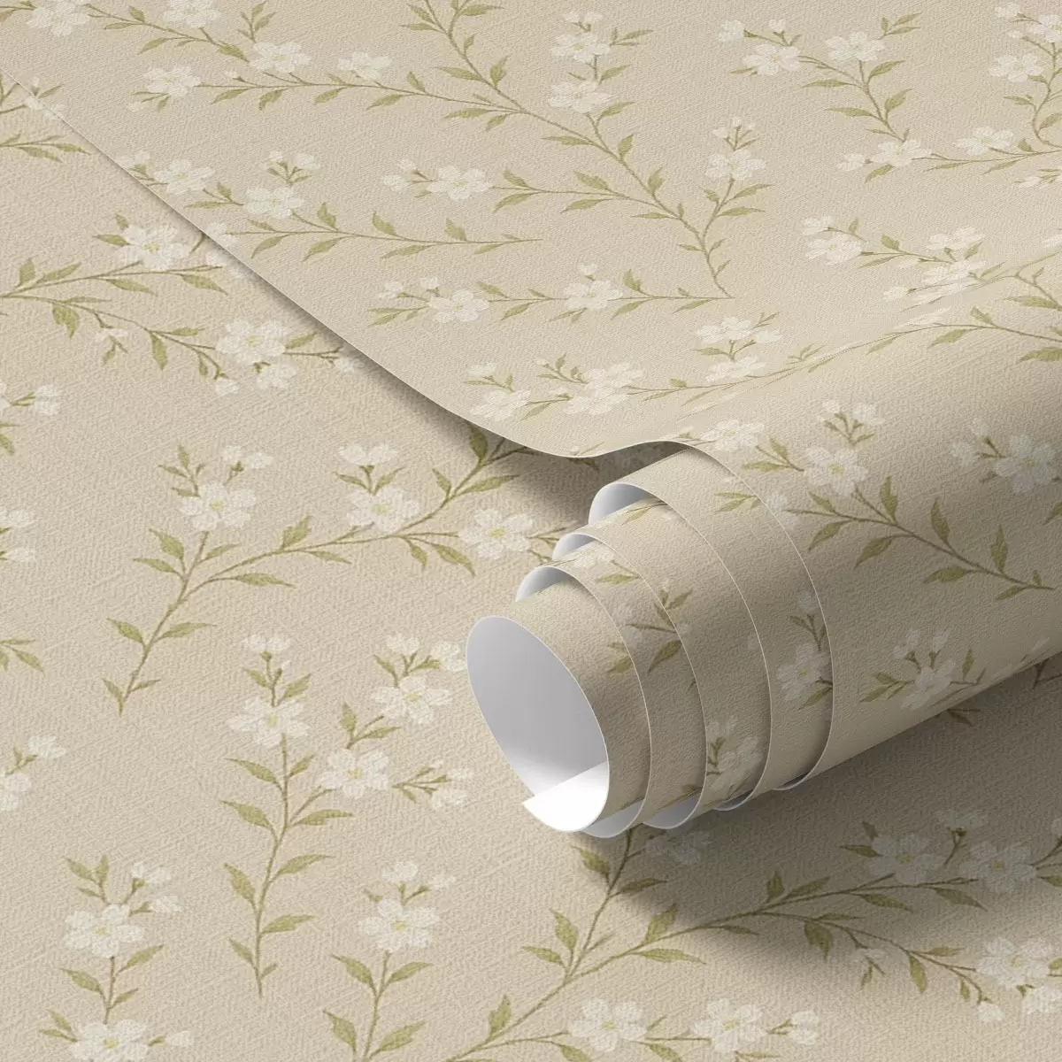 Behang Kleine witte takjes op een beige linnen achtergrond Nr. a00584