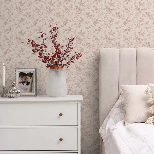 Behang Vogels en rozen, vintage patroon op poederroze Nr. a00587