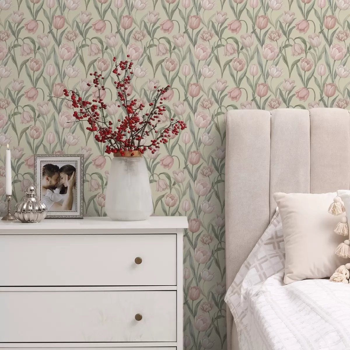 Behang Zachtroze tulpen op een zachte beige achtergrond Nr. a00589