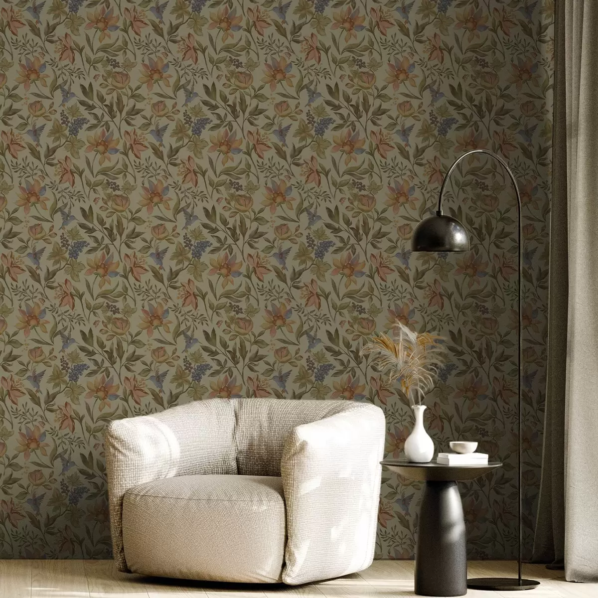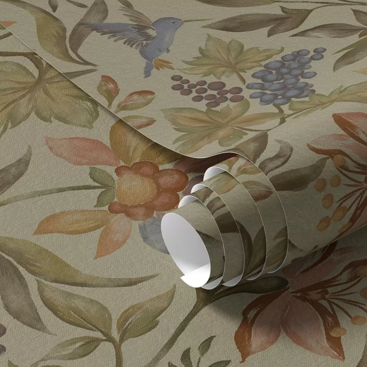 Behang Vintage bloemen en vogels met druiven op een olijfgroene achtergrond Nr. a00594