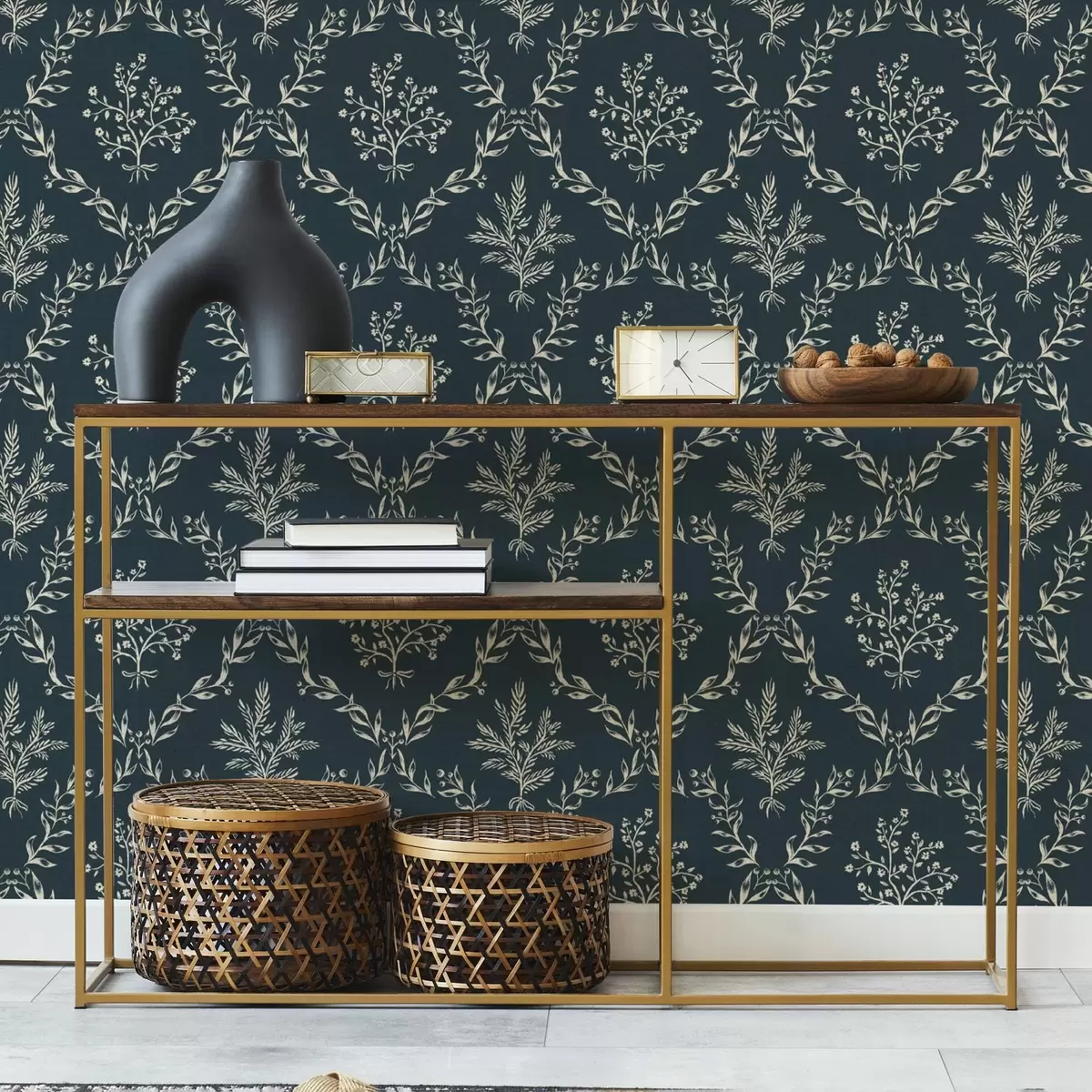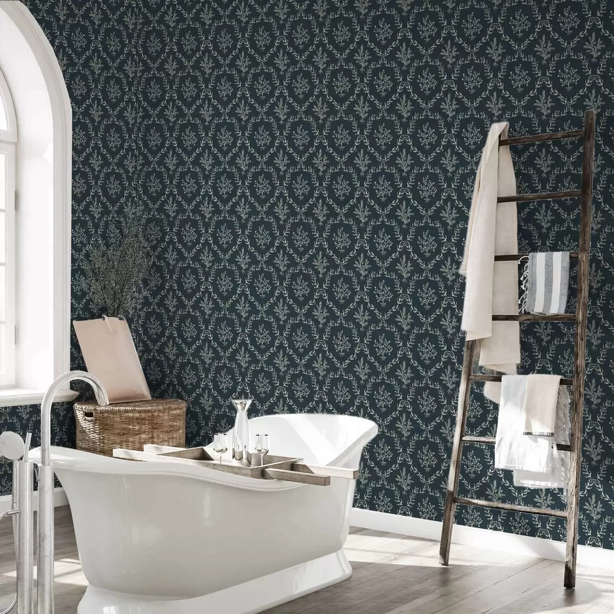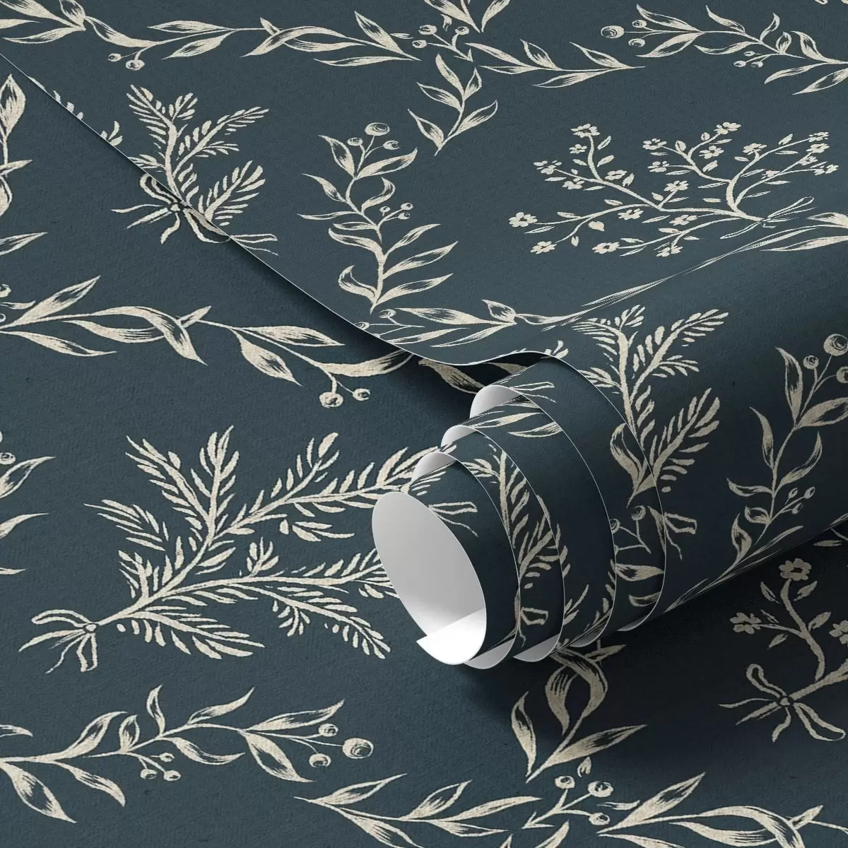 Behang Witte kransen van kruiden en bloemen op donkerblauwgroen Nr. a00599v2
