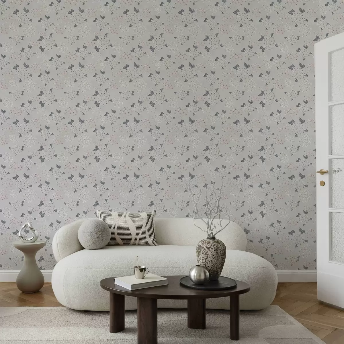 Behang Luchtige bloesems op een lichte achtergrond, zachte roze-grijze tinten Nr. a00600