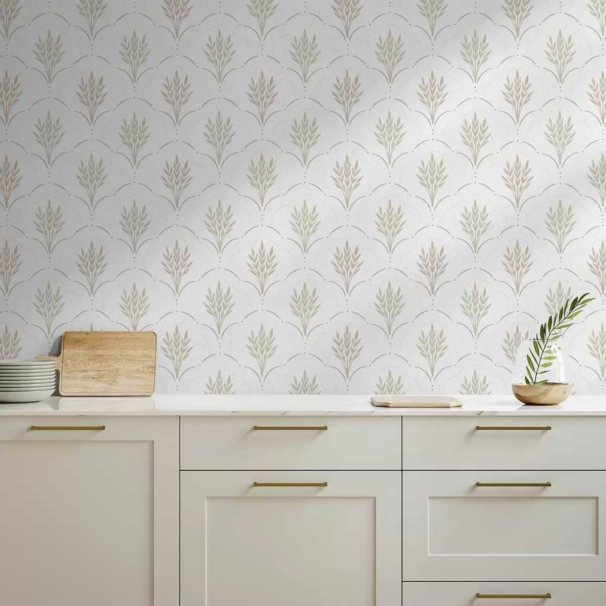 Behang Tarwe in een gebogen ornament, zachte pasteltinten op wit Nr. a00607v1