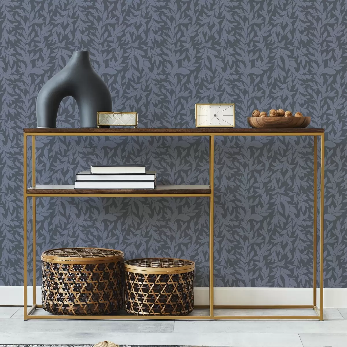 Behang Grafietblauwe achtergrond en blauwe bladeren, gestructureerde streep Nr. a00616v2
