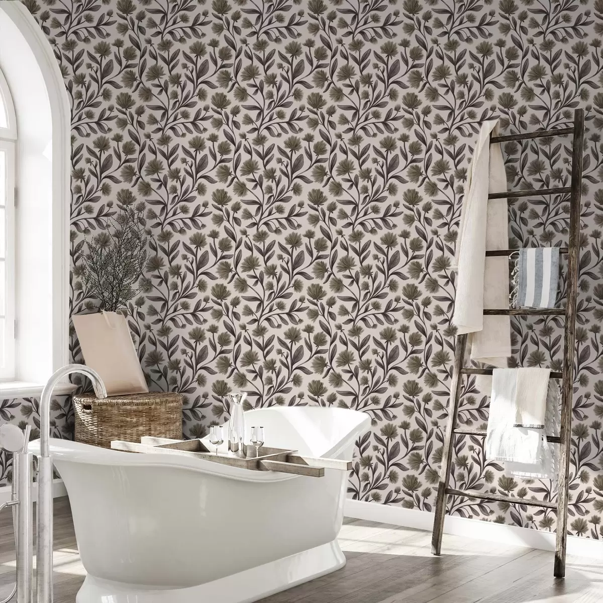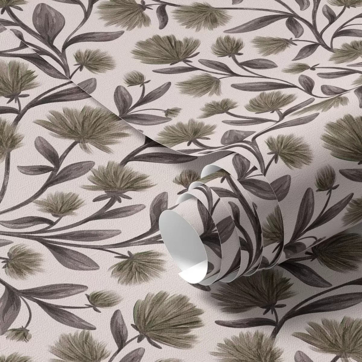Behang Wilde bloemen in grijs-olijfkleurige tinten op een crèmekleurige achtergrond Nr. a00623v1