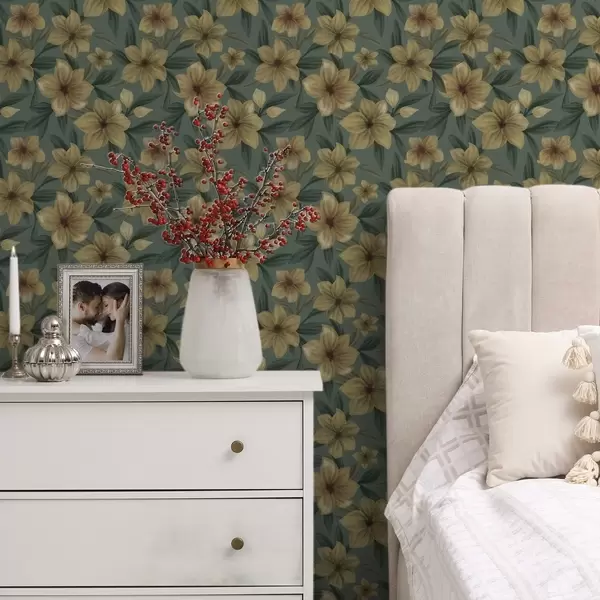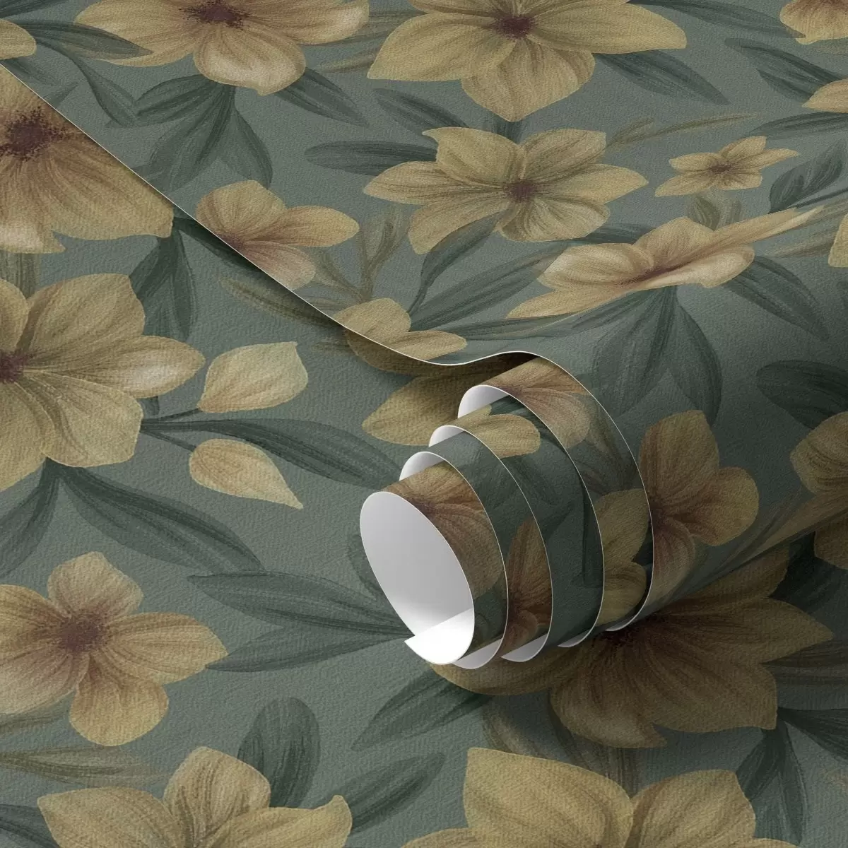Behang Okerkleurige bloemen op een diepgroene achtergrond, dicht patroon Nr. a00628