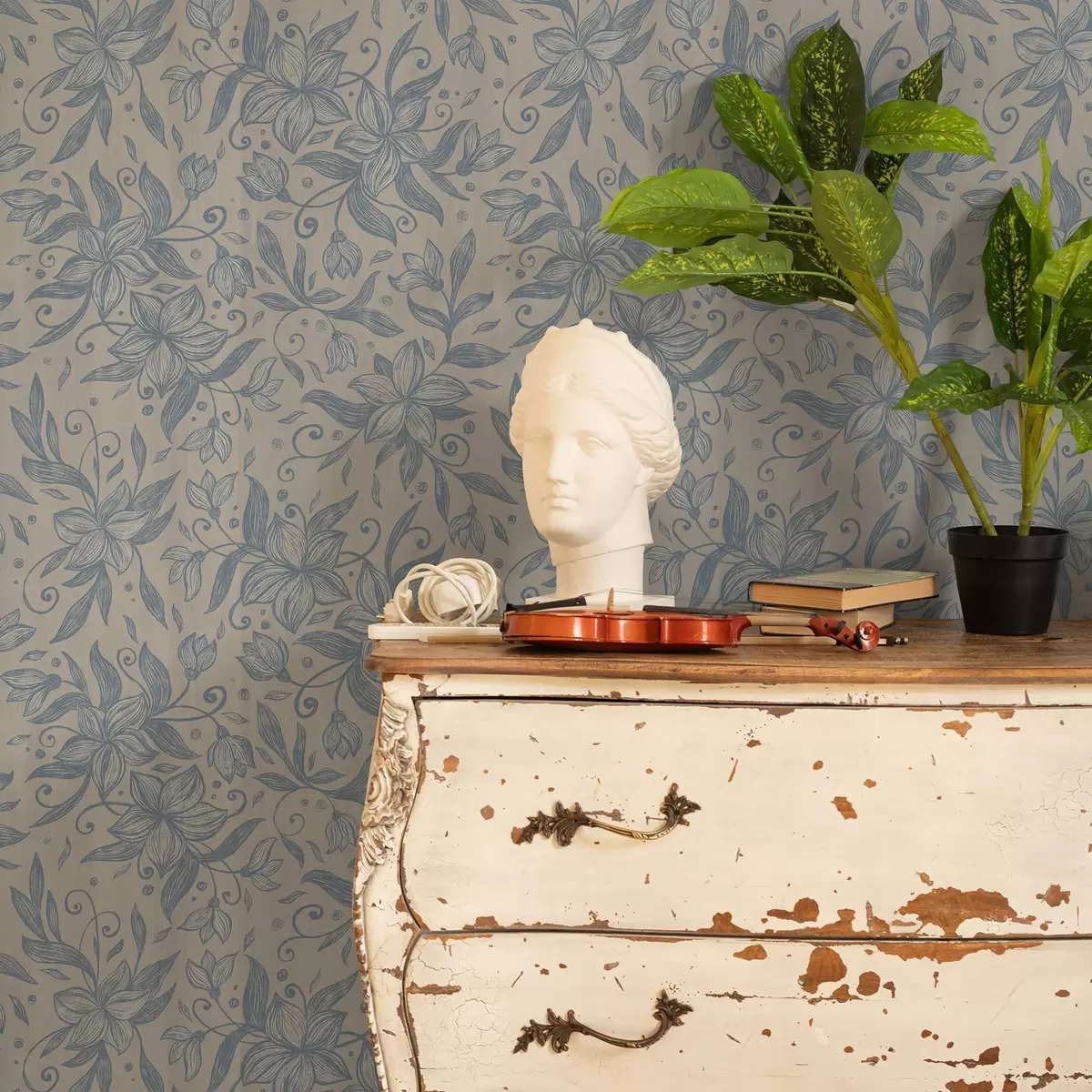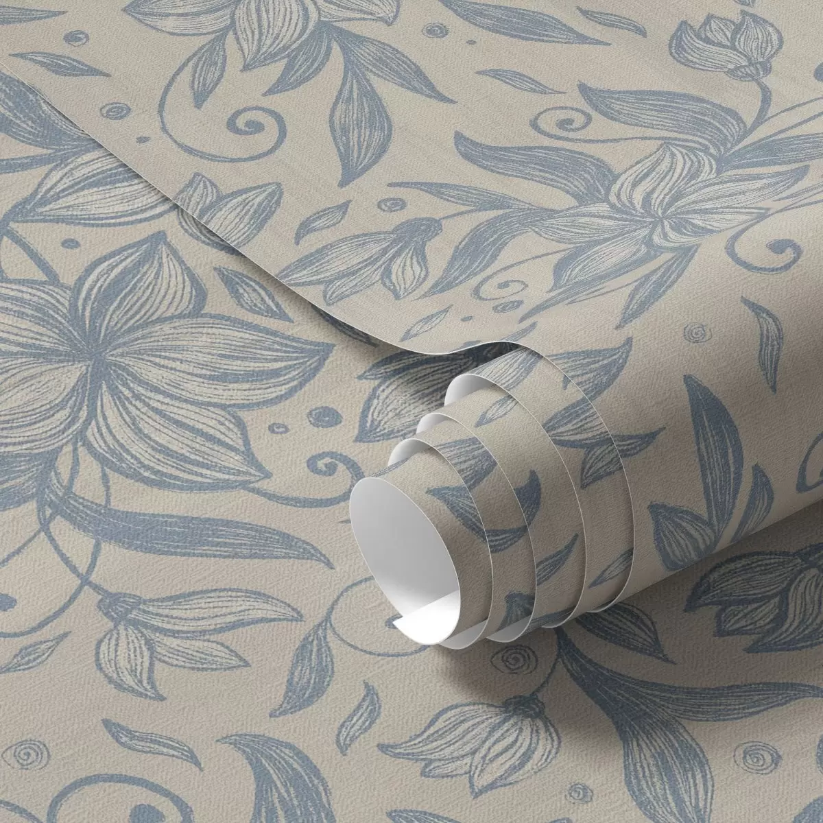 Behang Blauw lineair bloemenpatroon op warm beige Nr. a00630v2