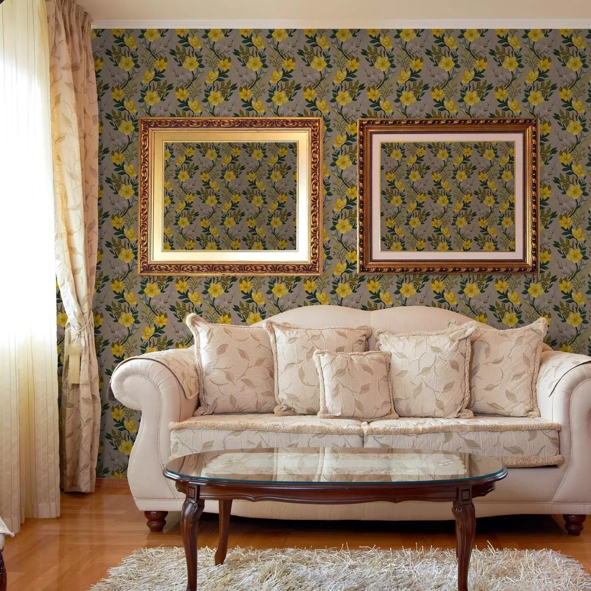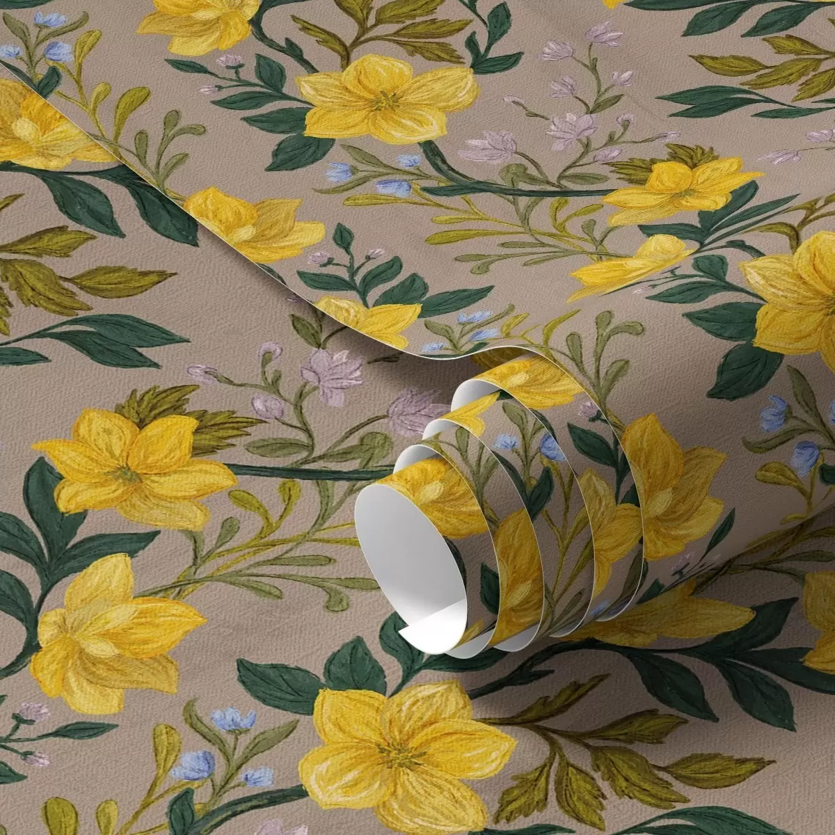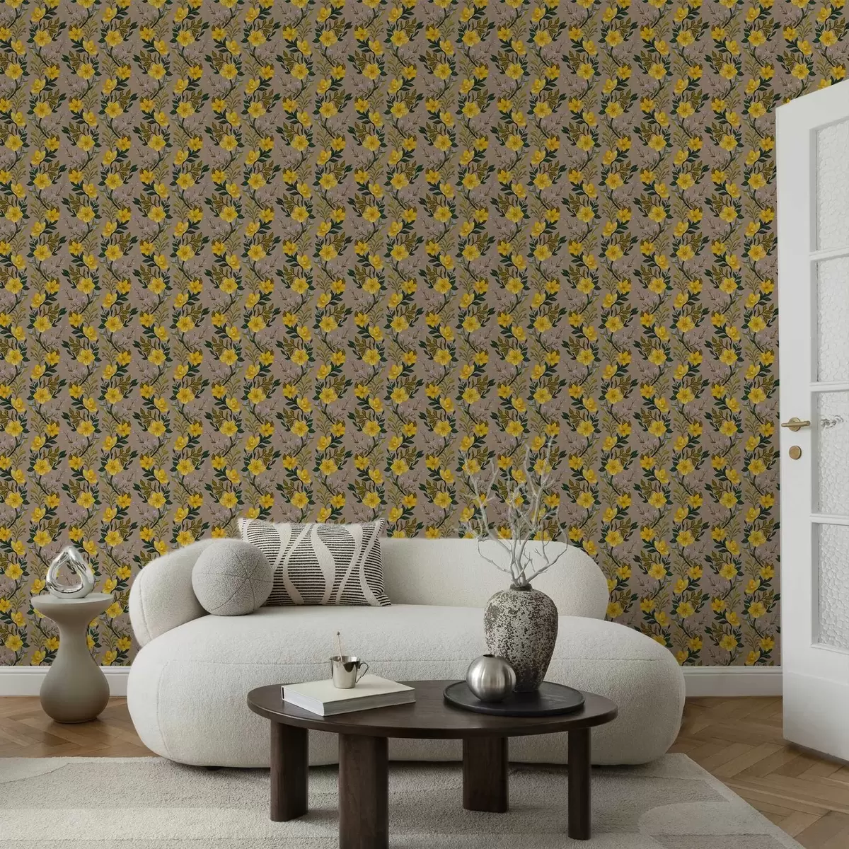 Behang Gele bloemen in verticale slingers op een taupekleurige achtergrond Nr. a00632v1