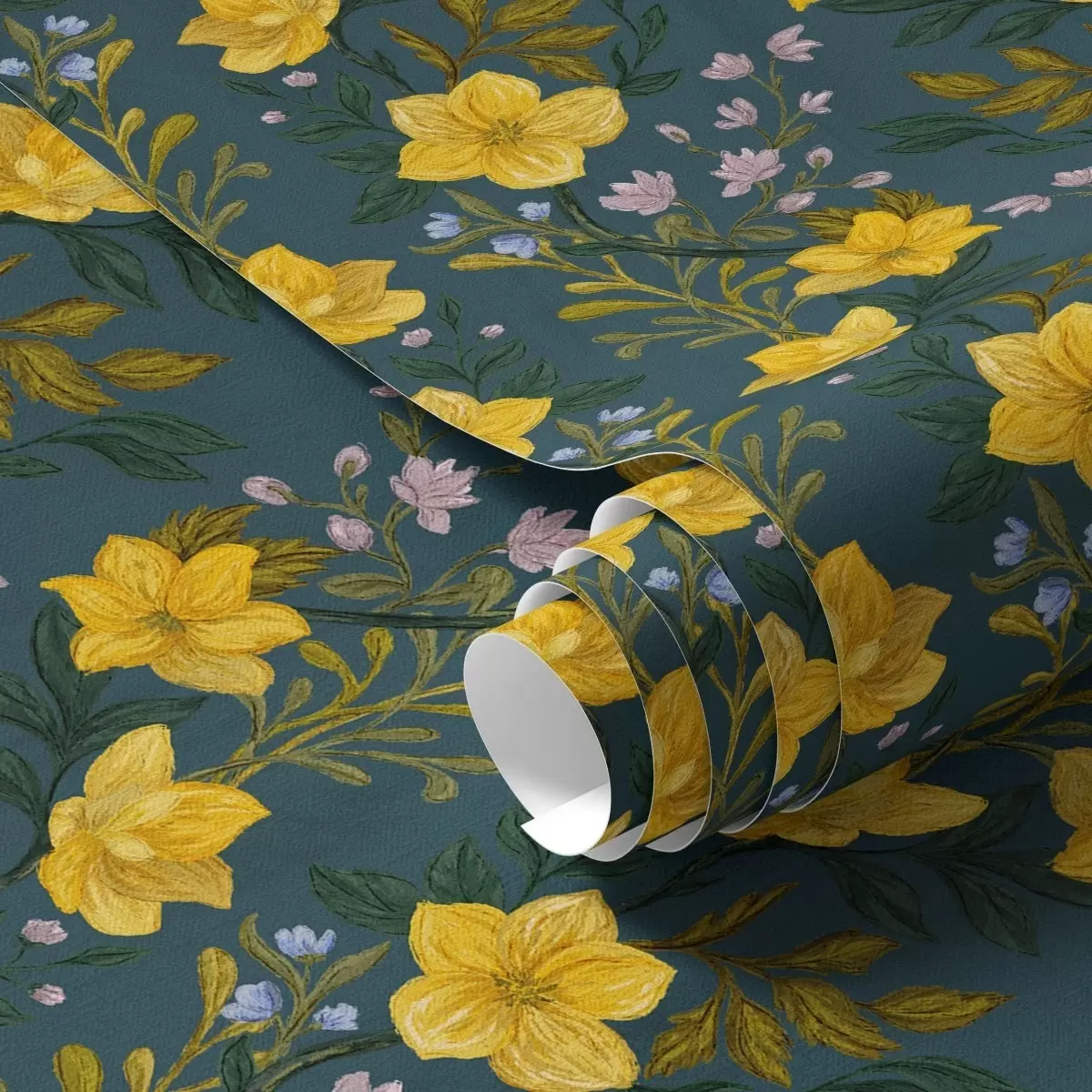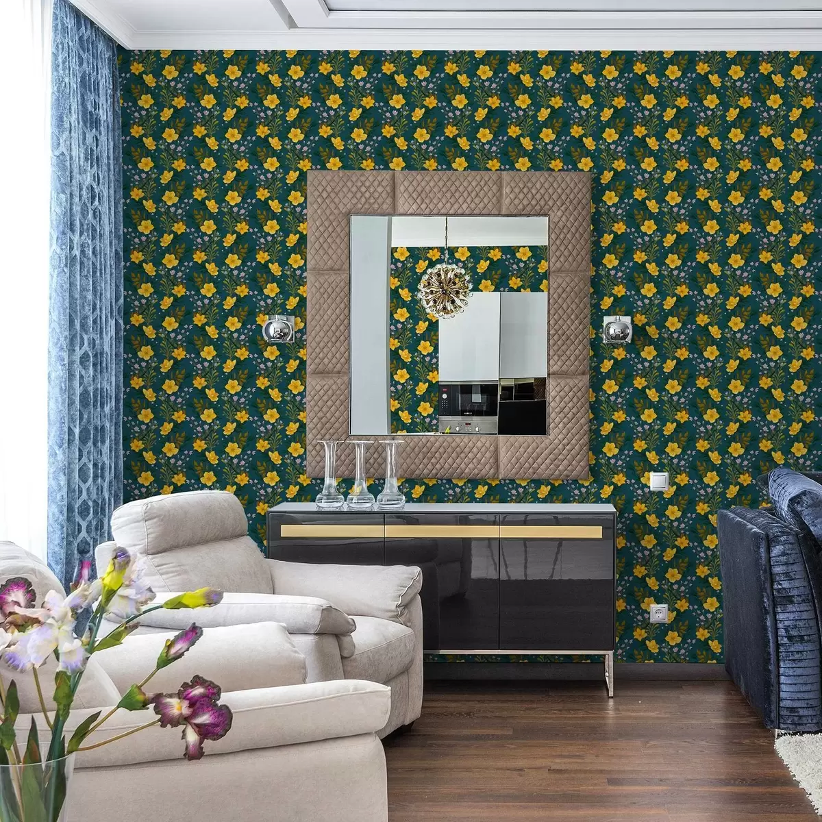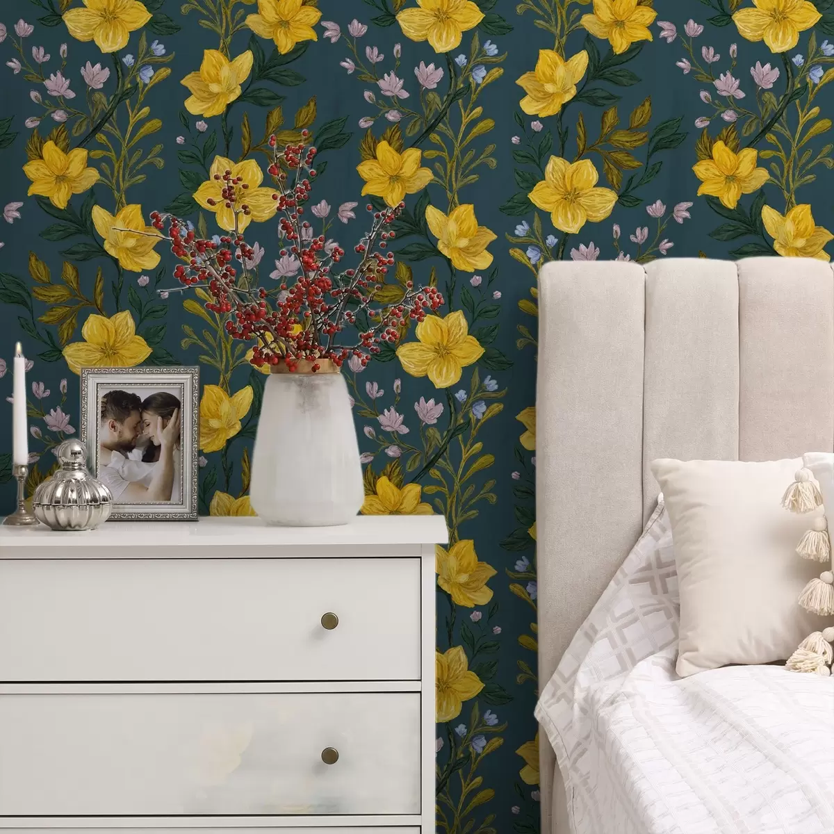 Behang Gele bloemen in verticale slingers op een donkerblauwe achtergrond Nr. a00632v2