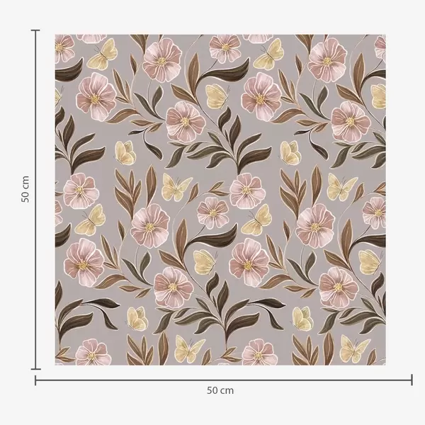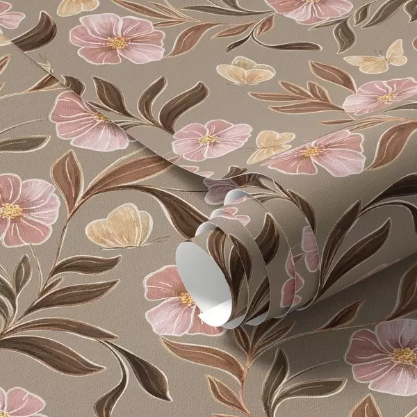 Behang Roze bloemen en vlinders op een olijfbeige achtergrond Nr. a00633v2