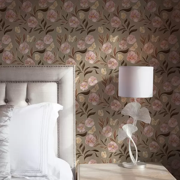 Behang Roze bloemen en vlinders op een olijfbeige achtergrond Nr. a00633v2