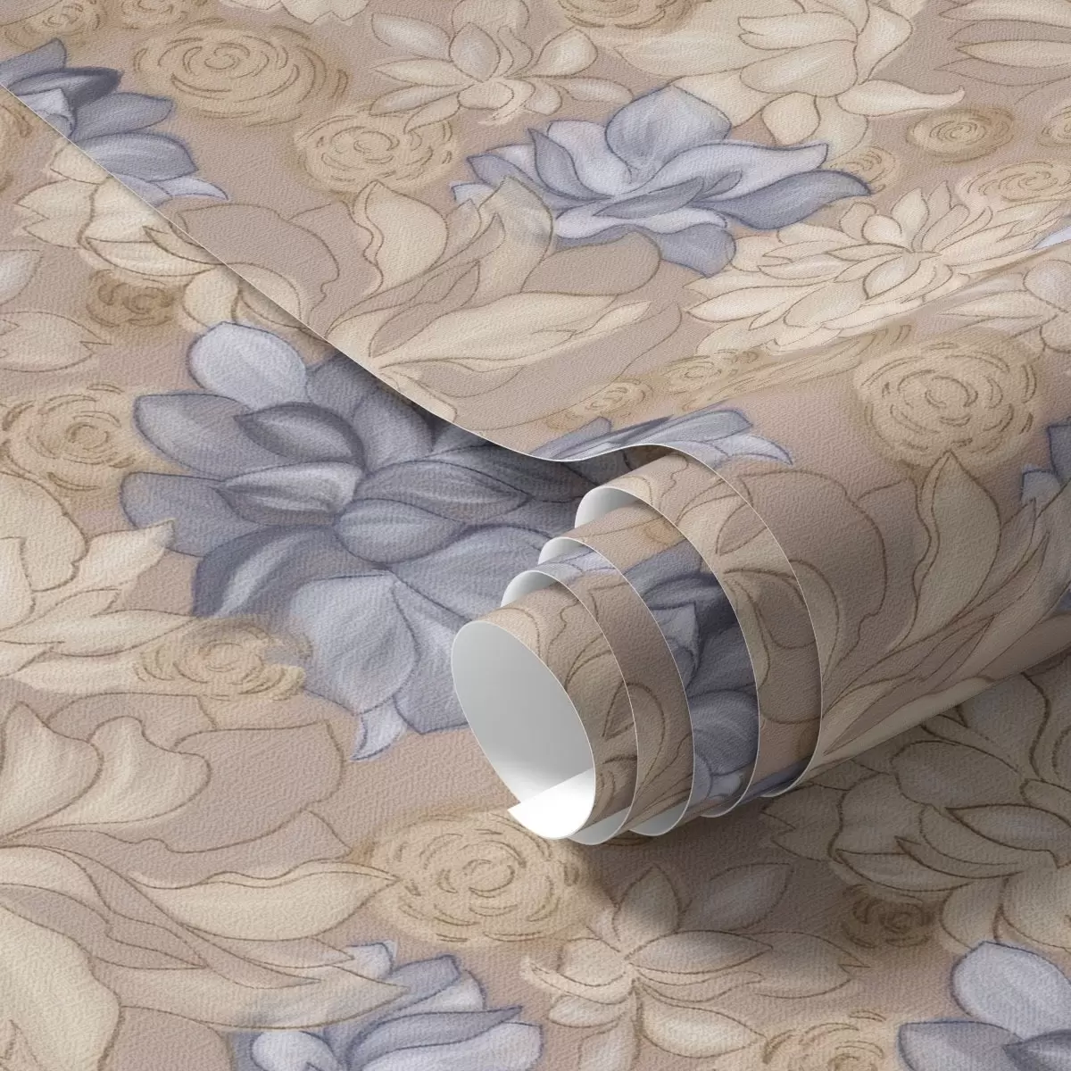 Behang Crèmekleurige en blauwe bloemen op een warme beige achtergrond Nr. a00634v1