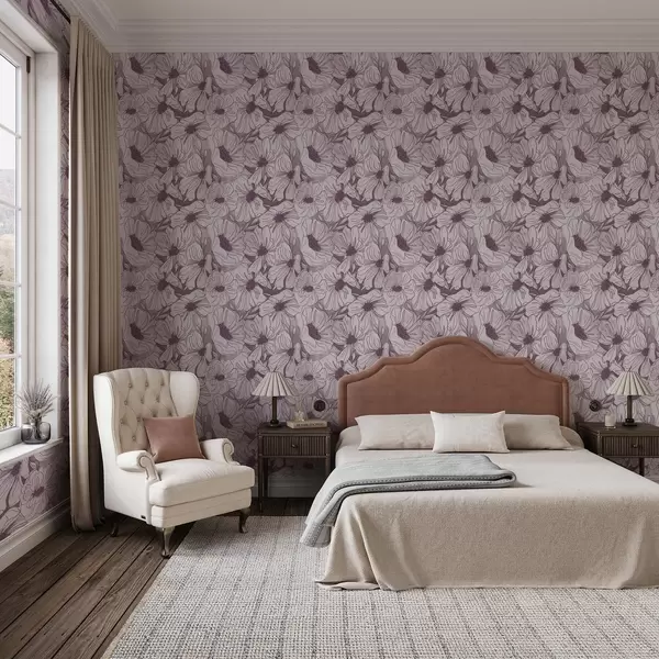 Behang Lineaire bloemen in een koel lila-roze kleurenpalet Nr. a00636v1