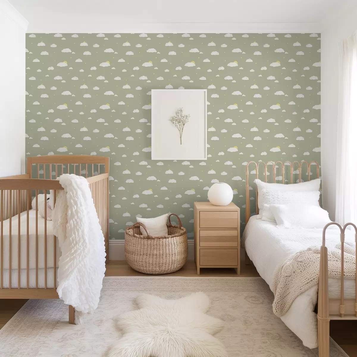 Behang Zachte wolken, sterren en zon op een groengrijze achtergrond Nr. a00652v1