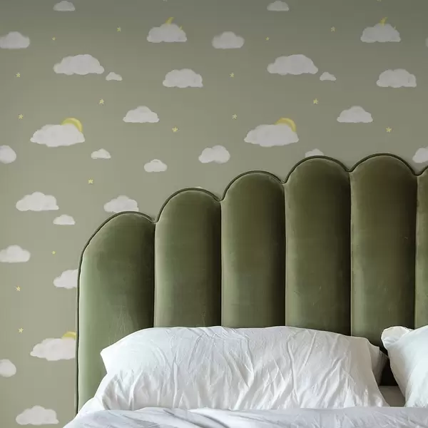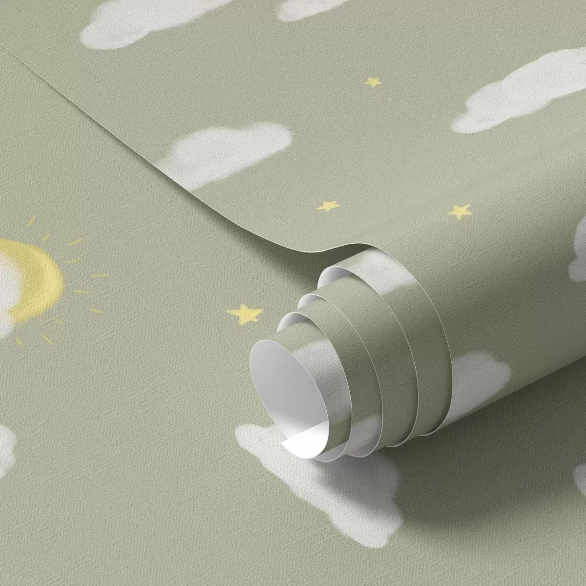 Behang Zachte wolken, sterren en zon op een groengrijze achtergrond Nr. a00652v1