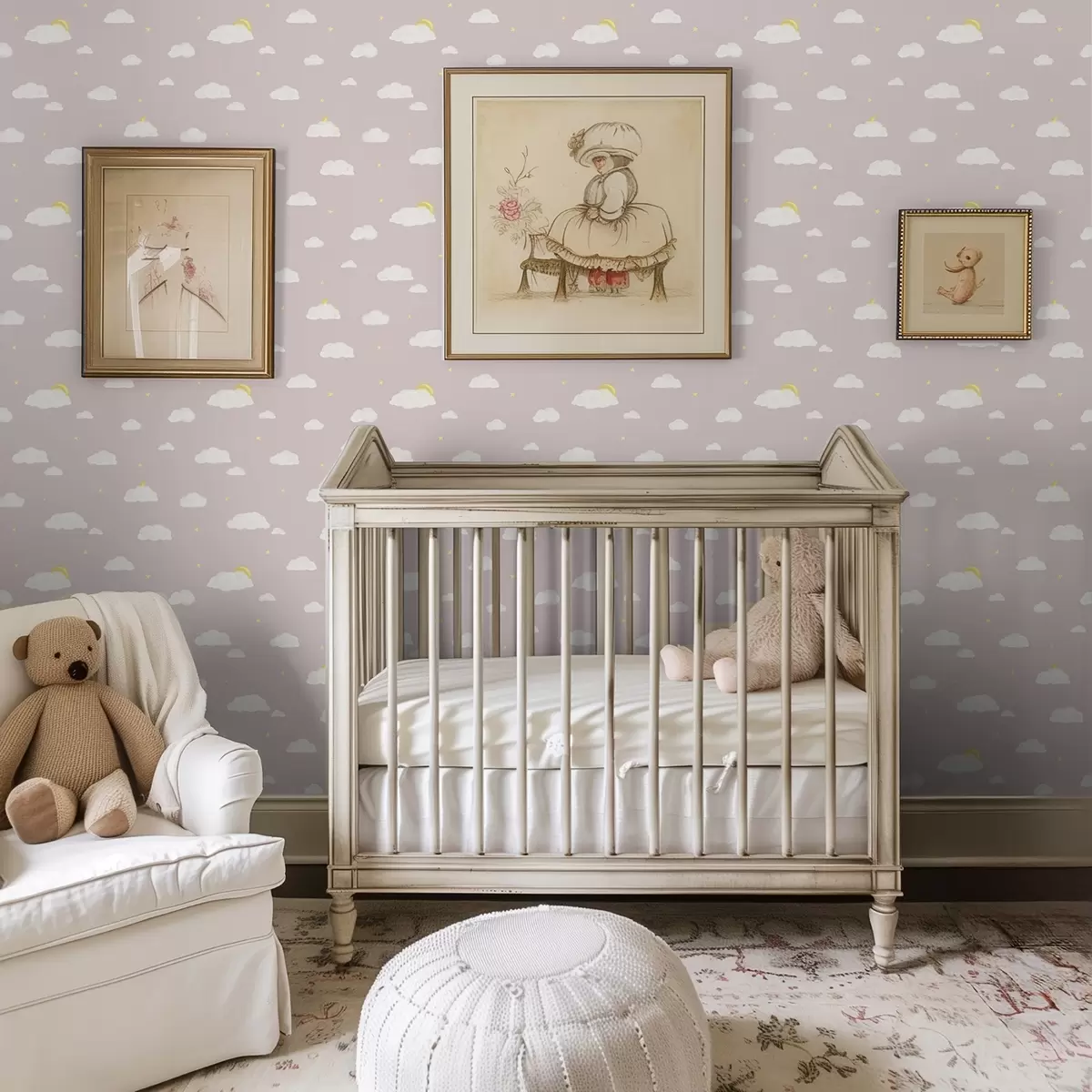 Behang Zachte wolken, sterren en zon op een roze-grijze achtergrond Nr. a00652v2