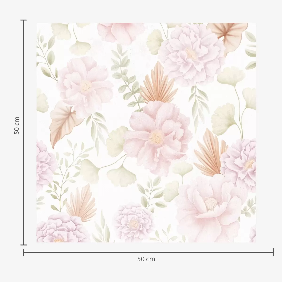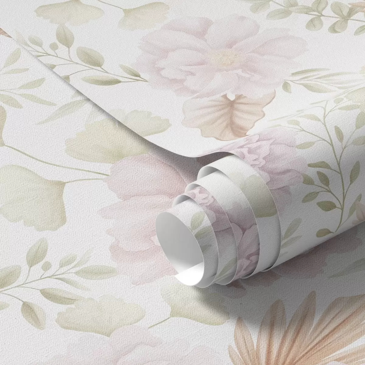 Behang Zachte pastelkleurige pioenrozen en bladeren op een witte achtergrond Nr. a00669