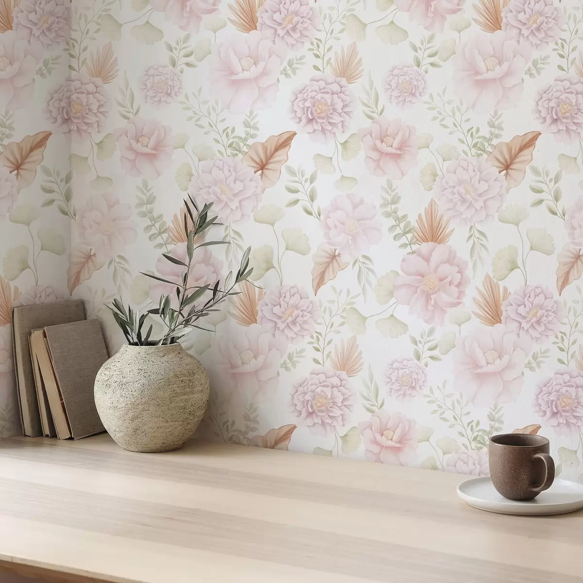 Behang Zachte pastelkleurige pioenrozen en bladeren op een witte achtergrond Nr. a00669