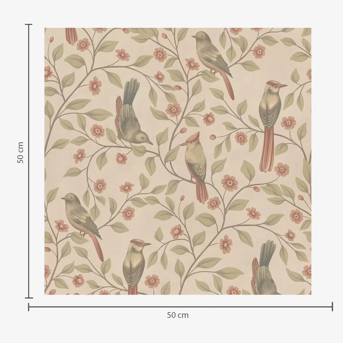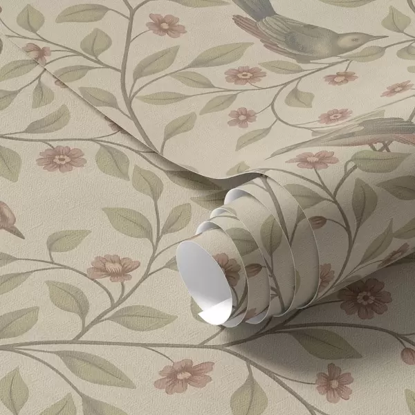 Behang Vogels op bloeiende takken, warme beige achtergrond Nr. a00670