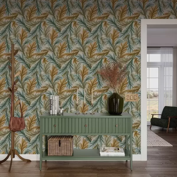 Behang Decoratief blad in een warm oker- en groenpalet Nr. a00673