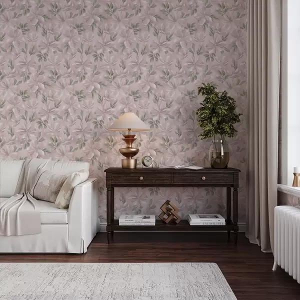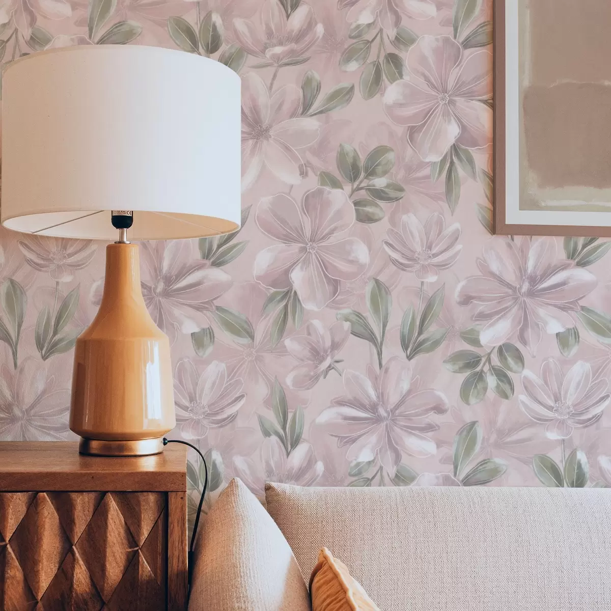 Behang Roze bloemen met delicate bladeren op een zachte achtergrond Nr. a00675