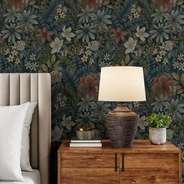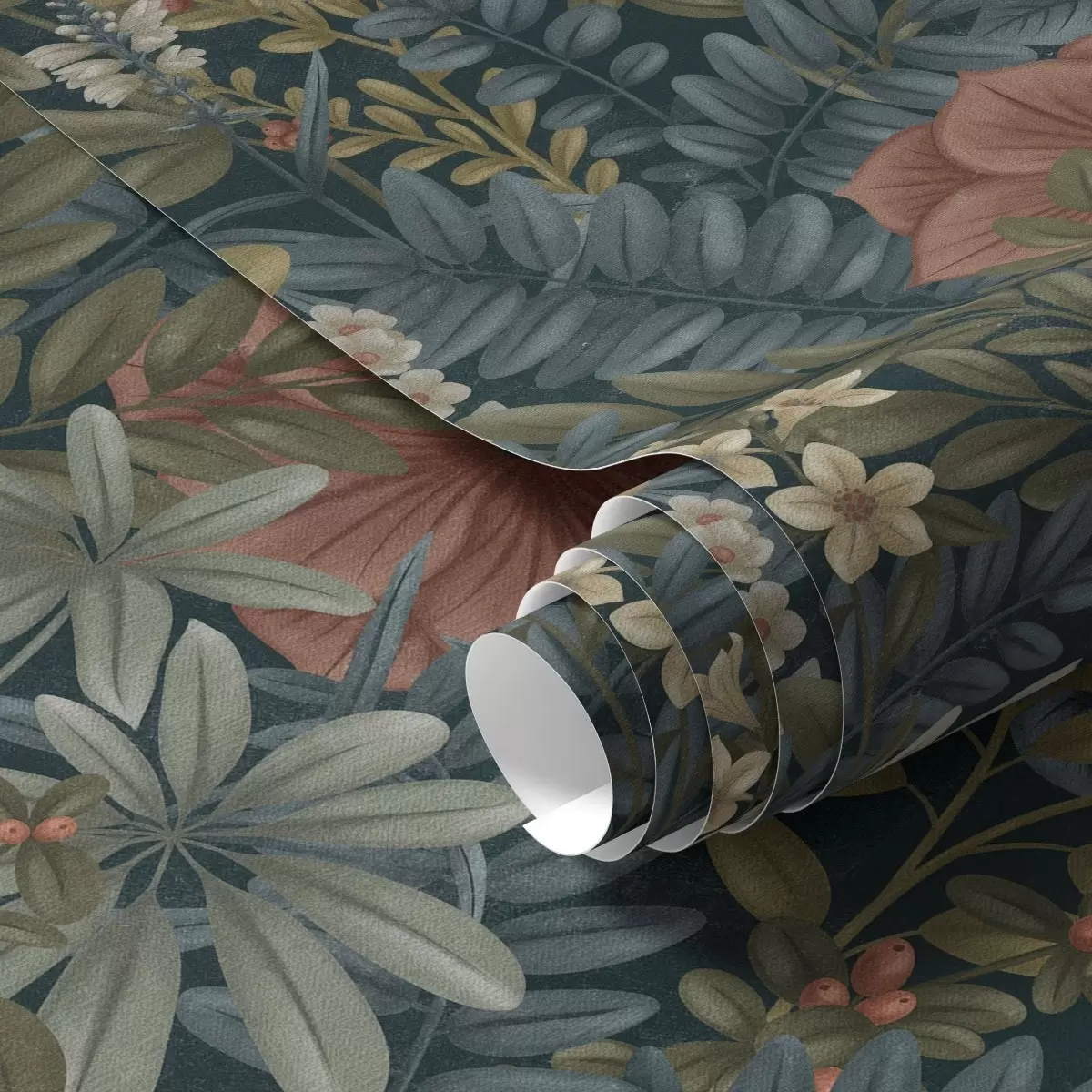 Behang Donkere achtergrond met dichte bloemen en bladeren in warme tinten Nr. a00678