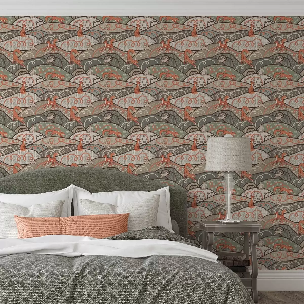 Behang Vossen en hazen op golvende heuvels, retro patroon Nr. a00690