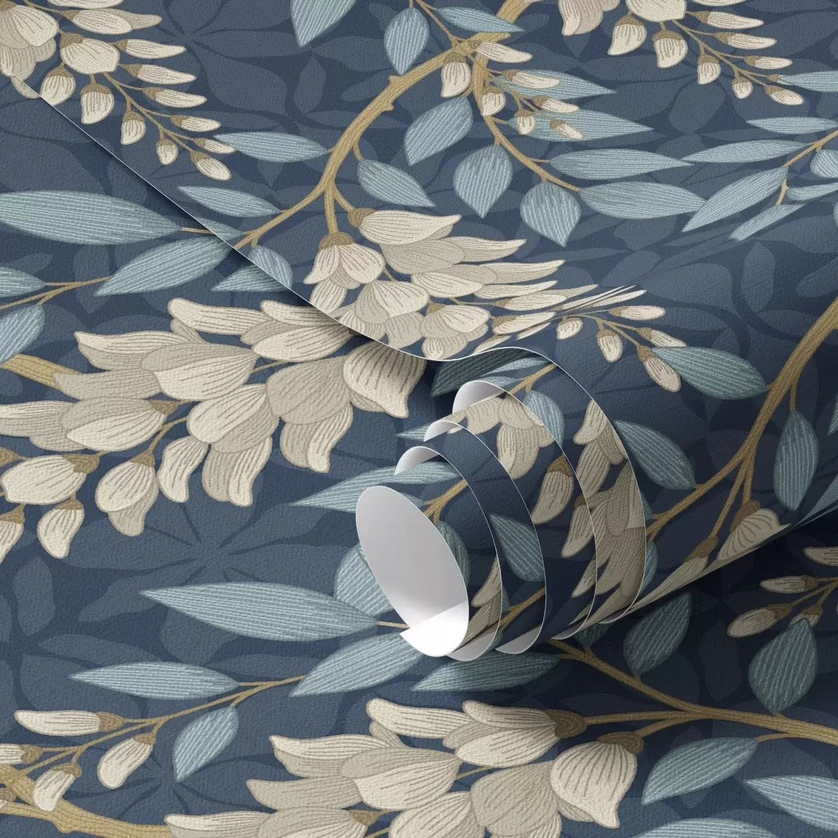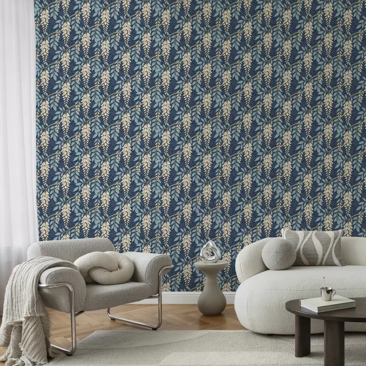 Behang Blauwe bladeren van blauweregen op een donkerblauwe achtergrond Nr. a00694v2