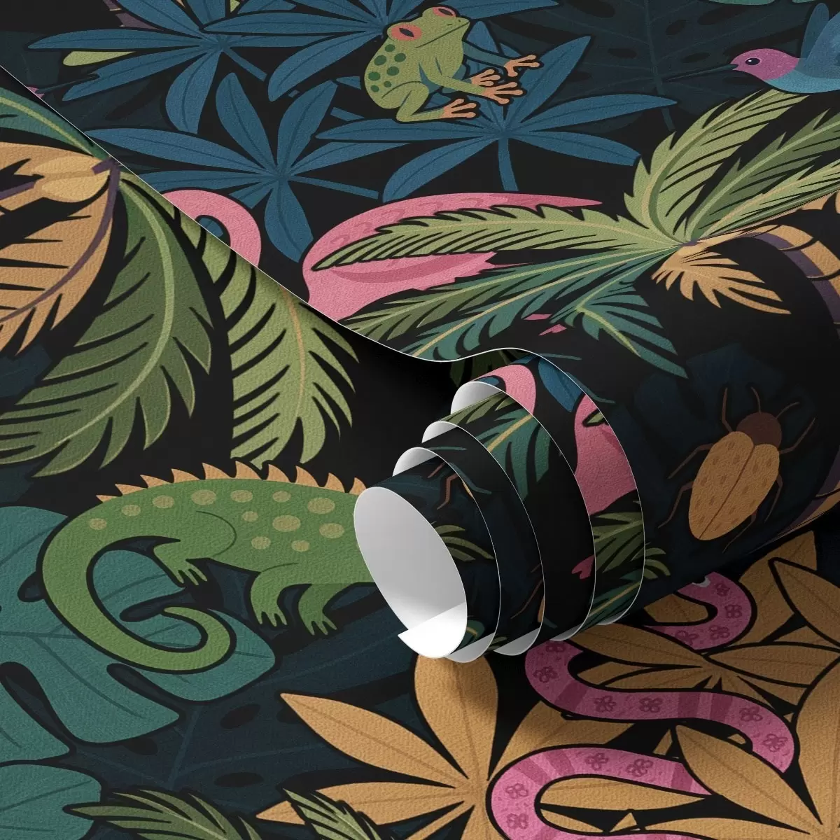 Behang Heldere tropische dieren tussen het gebladerte op een donkere achtergrond Nr. a00701